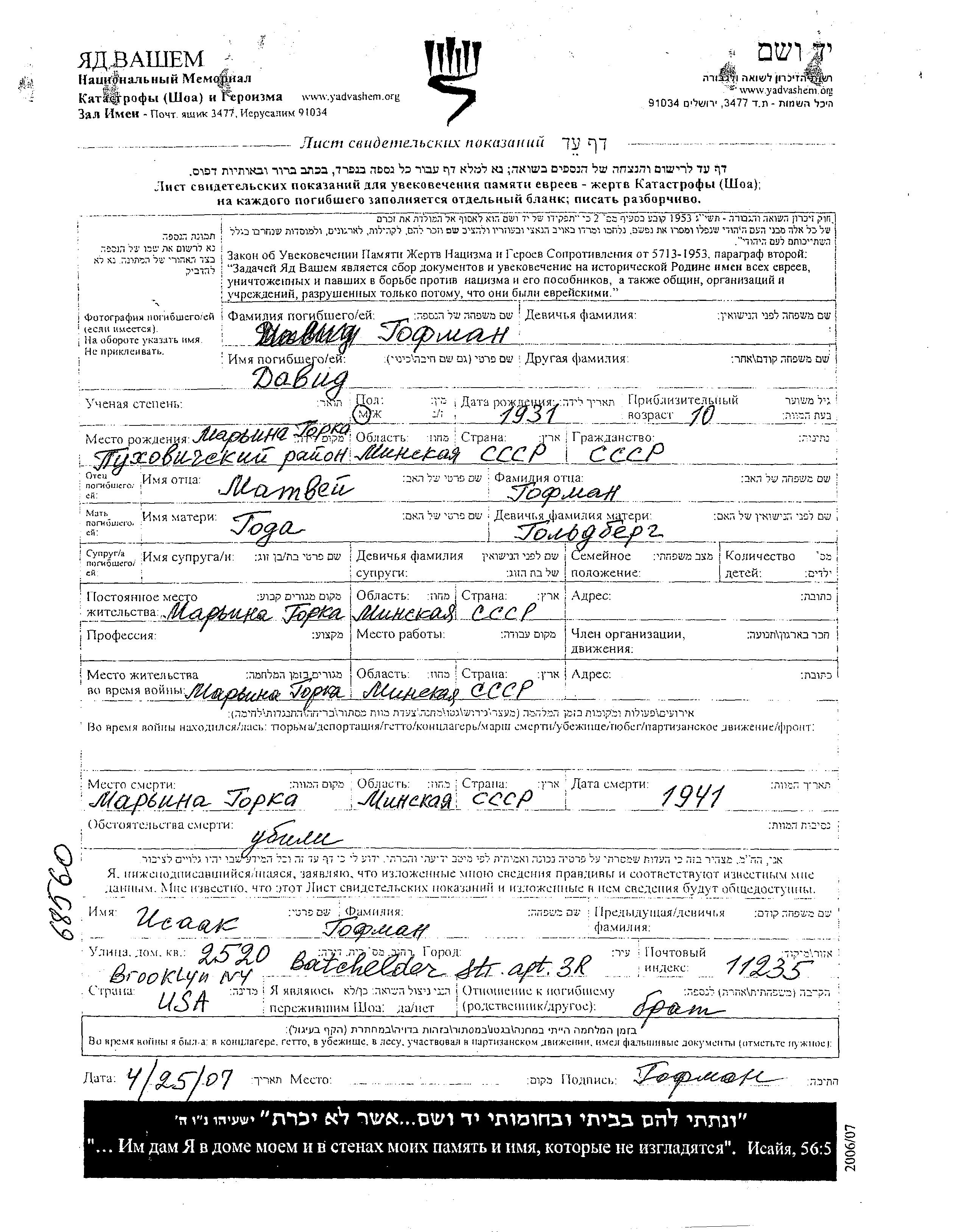 Давид Гофман, место рождения: Марьина Горка, Белоруссия (СССР). Отец: Матвей, mать:Года, девичья фамилия Гольдберг. Ребенок. Место жительства до войны: Марьина Горка, Белоруссия (СССР). Место во время войны: Марьина Горка, Белоруссия (СССР).