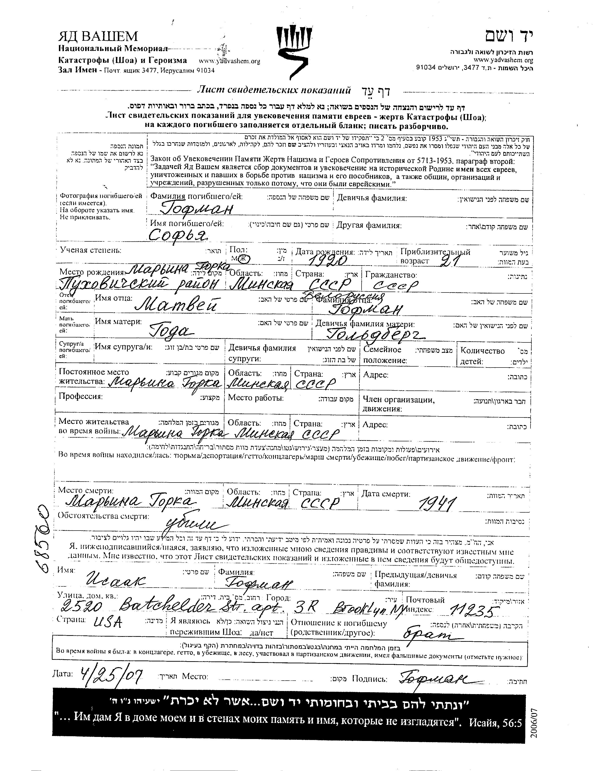 Гофман Софья 1920 Марьина Горка, Белоруссия (СССР) Лист свидетельских показаний