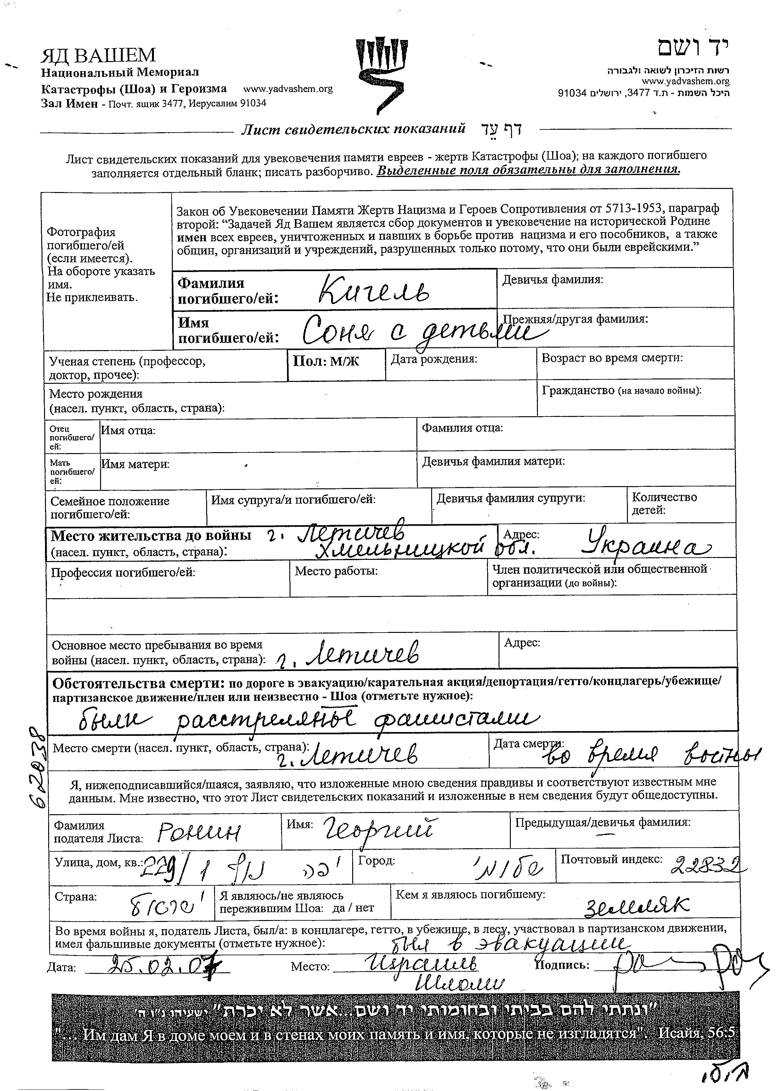 Кигель Соня Летичев, Украина (СССР) Лист свидетельских показаний