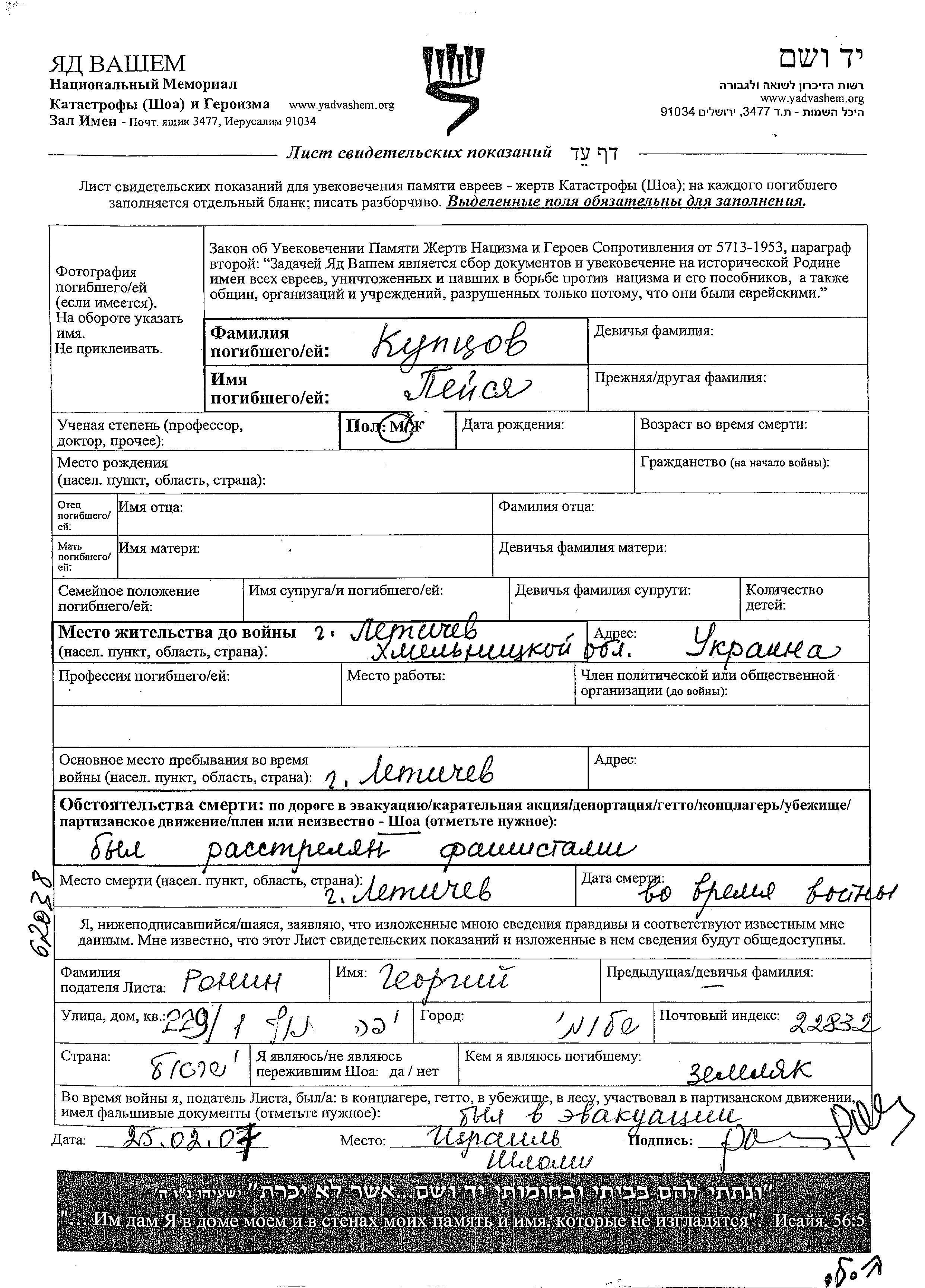 Купцов Пейся Летичев, Украина (СССР) Лист свидетельских показаний