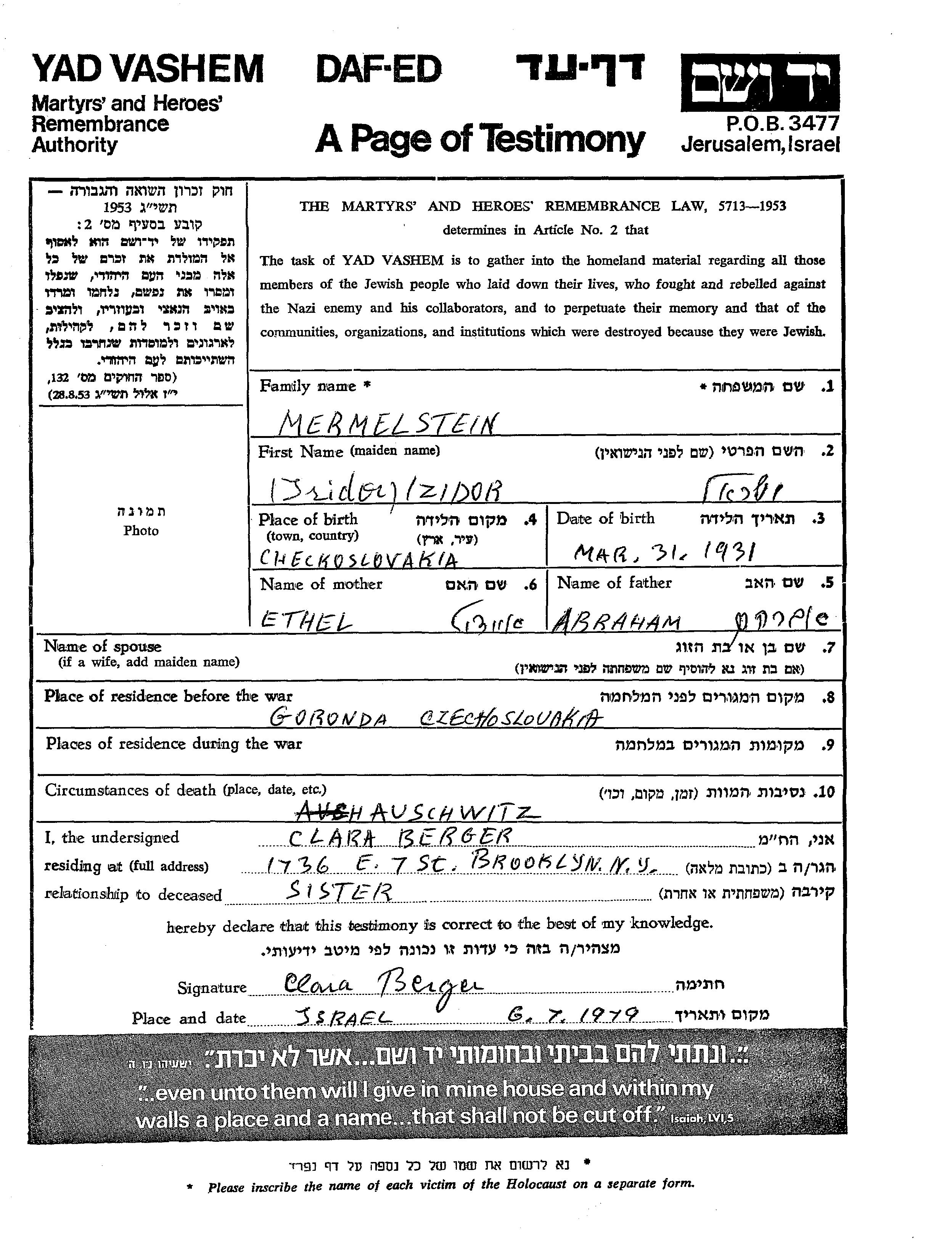 Изидор Исраэль Мермельштейн, место рождения: Чехословакия. Отец: Абраам, mать:Этель Эйдиль. Место жительства до войны: Горонда, Чехословакия. Место во время войны: Аушвиц, Польша.