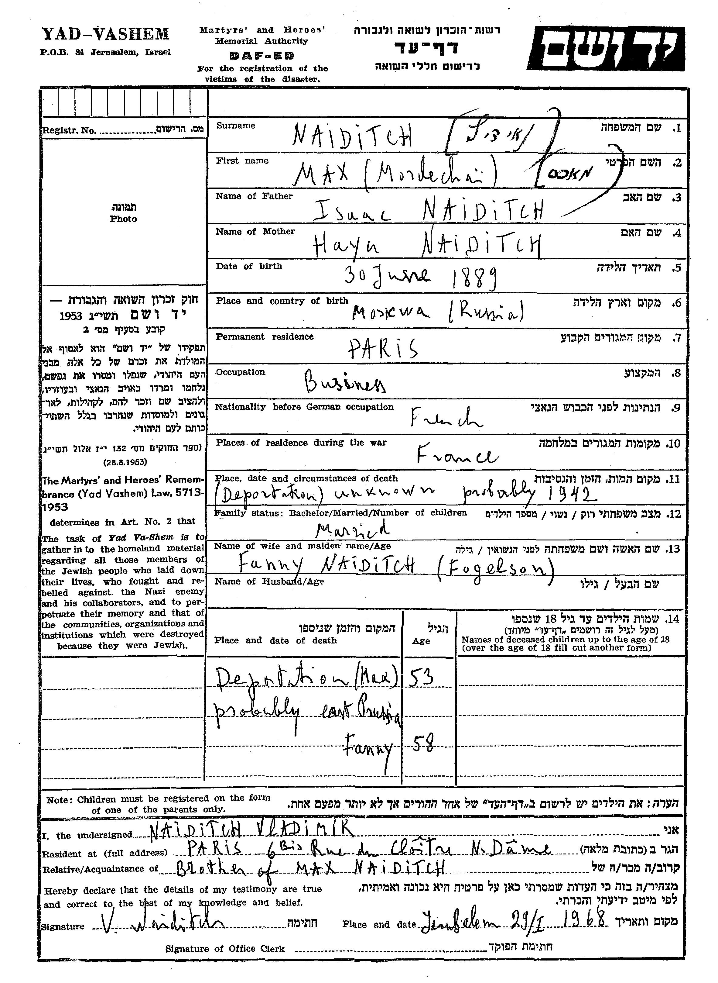 Макс Мордехай Найдич, место рождения: Москва, Россия (СССР). Отец: Исаак, mать:Хая. Предприниматель. Женат / замужем. Место жительства до войны: Париж, Франция. Место во время войны: Франция.