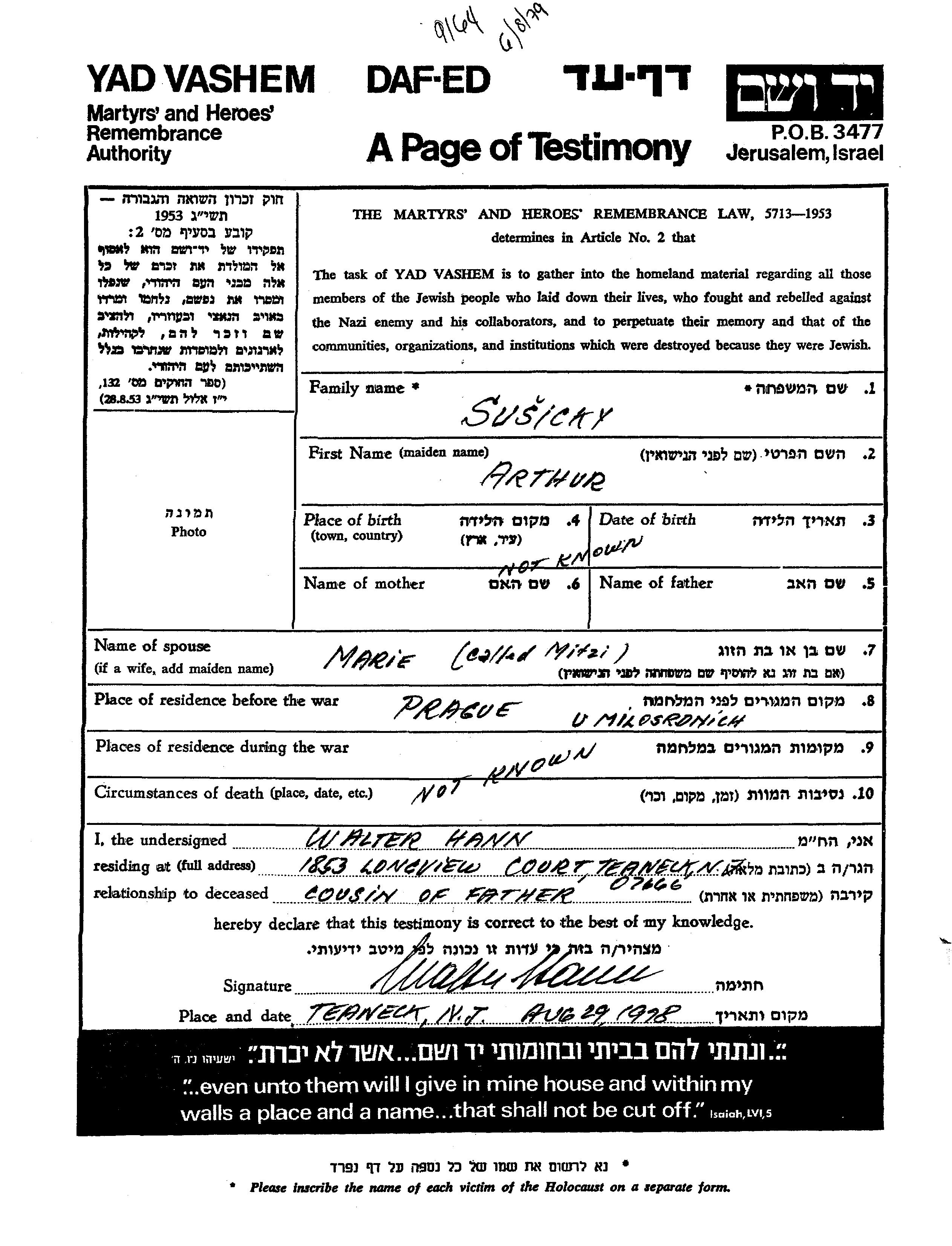 Сушицки Артур Прага, Чехословакия Лист свидетельских показаний