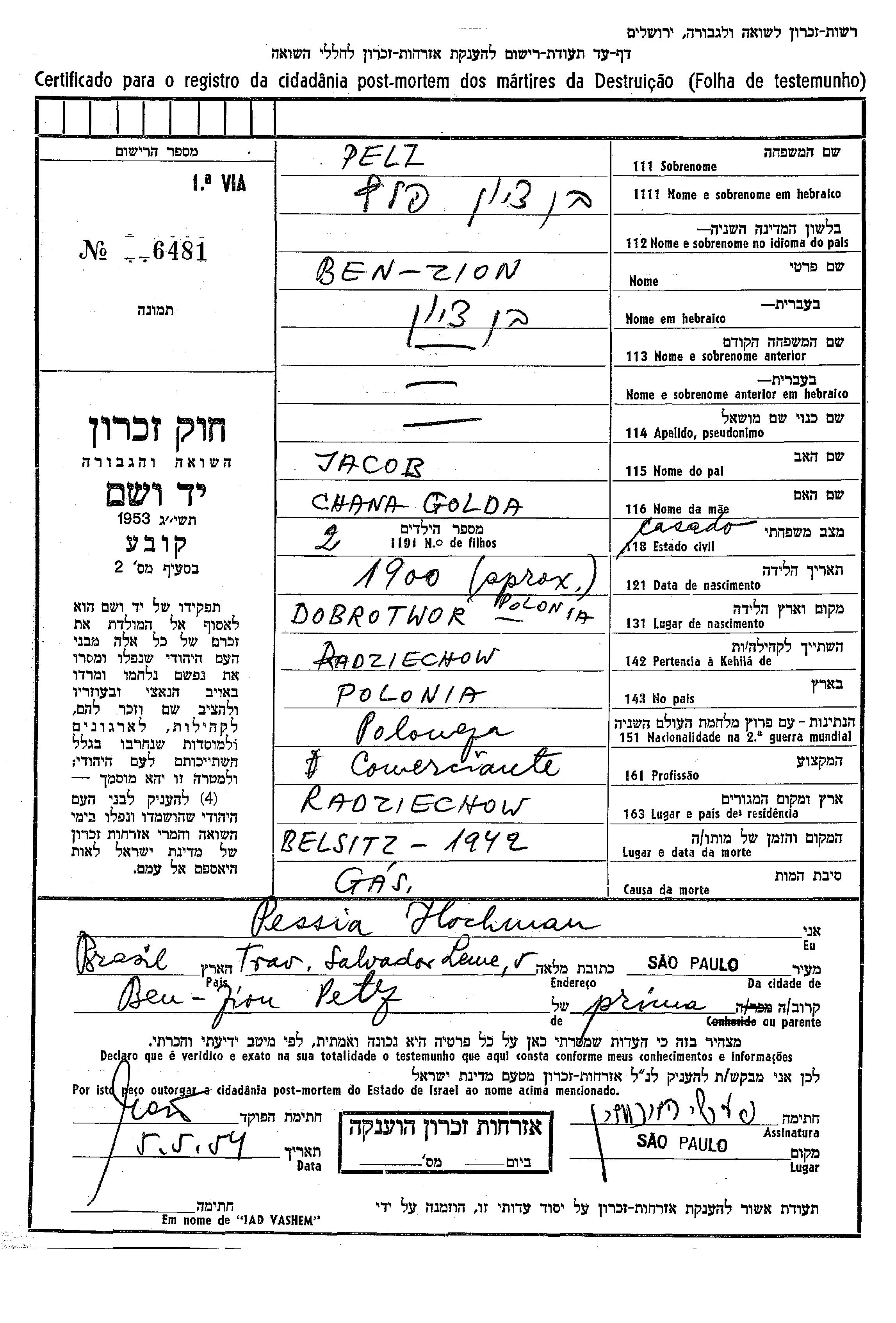 Бен Цион Пельц, место рождения: Добротвор, Польша. Отец: Якоб, mать:Хана. Торговец / торговка. Женат / замужем. Место жительства до войны: Радехов, Польша. Место во время войны: Польша.