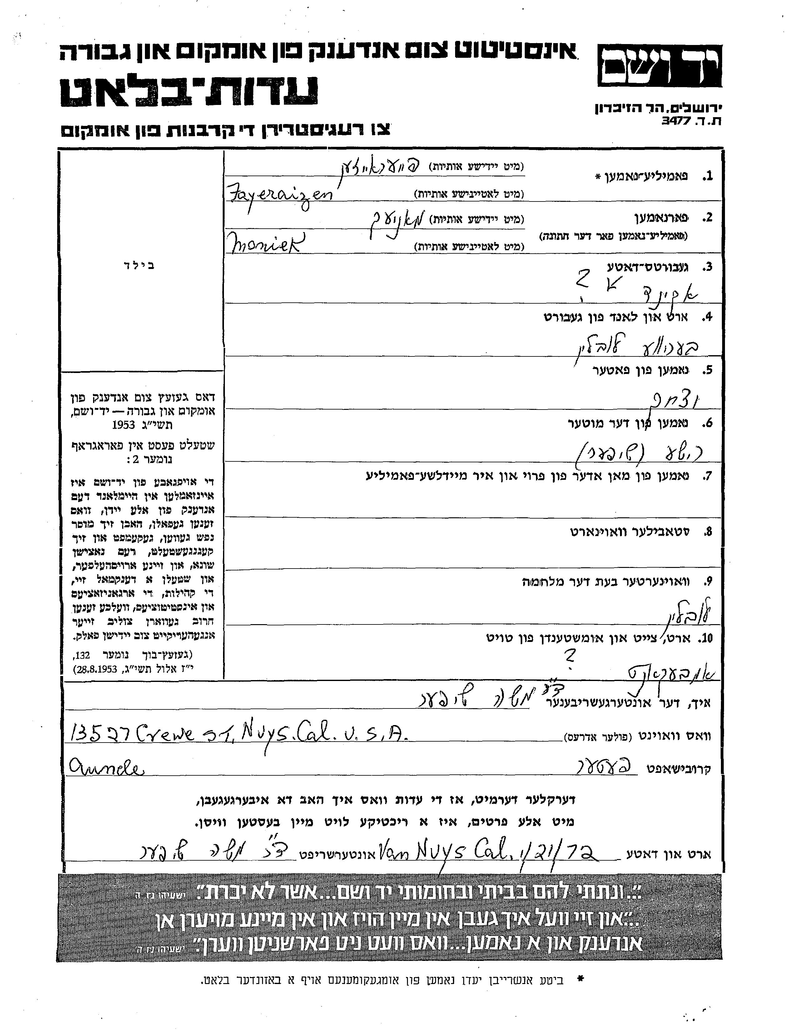 Монек Файерайзен, место рождения: Быхава, Польша. Отец: Ицхак, mать:Рише. Место во время войны: Люблин, Польша.