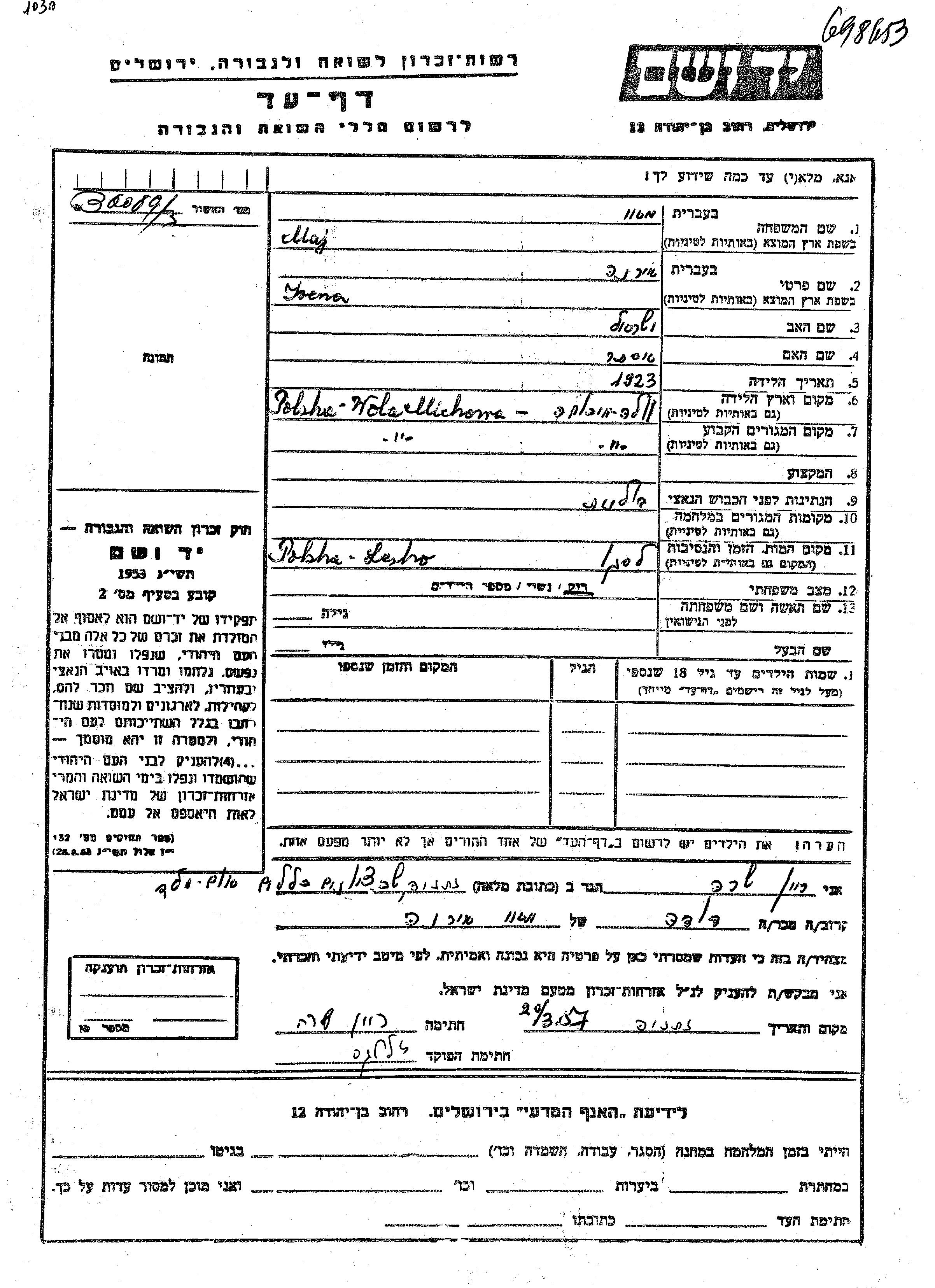 Ирена Май, место рождения: Воля-Михова, Польша. Отец: Исраэль, mать:Эстер. Холост / не замужем. Место жительства до войны: Воля-Михова, Польша.