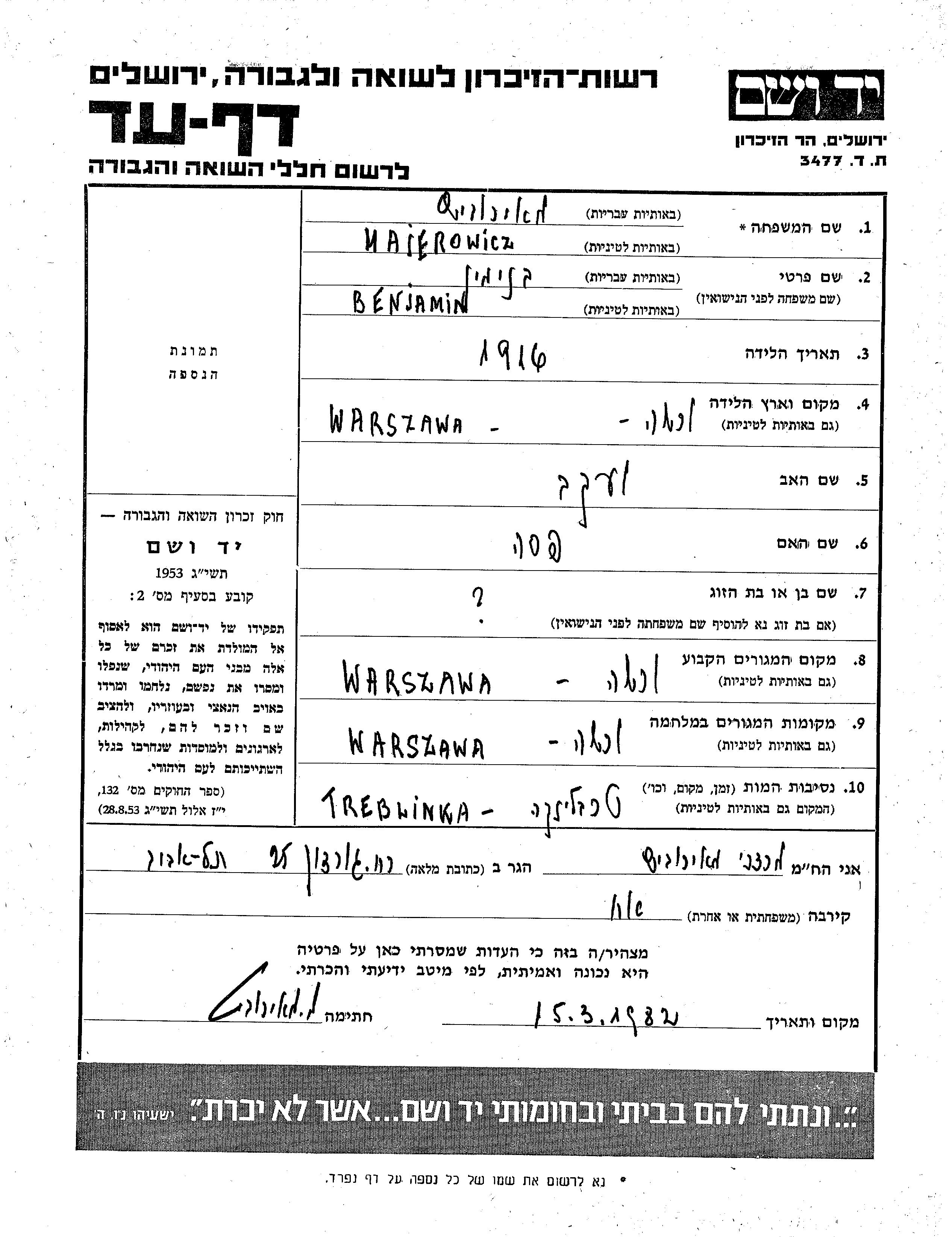 Беньямин Маерович, место рождения: Варшава, Польша. Отец: Яков, mать:Песа. Место жительства до войны: Варшава, Польша. Место во время войны: Варшава, Польша.
