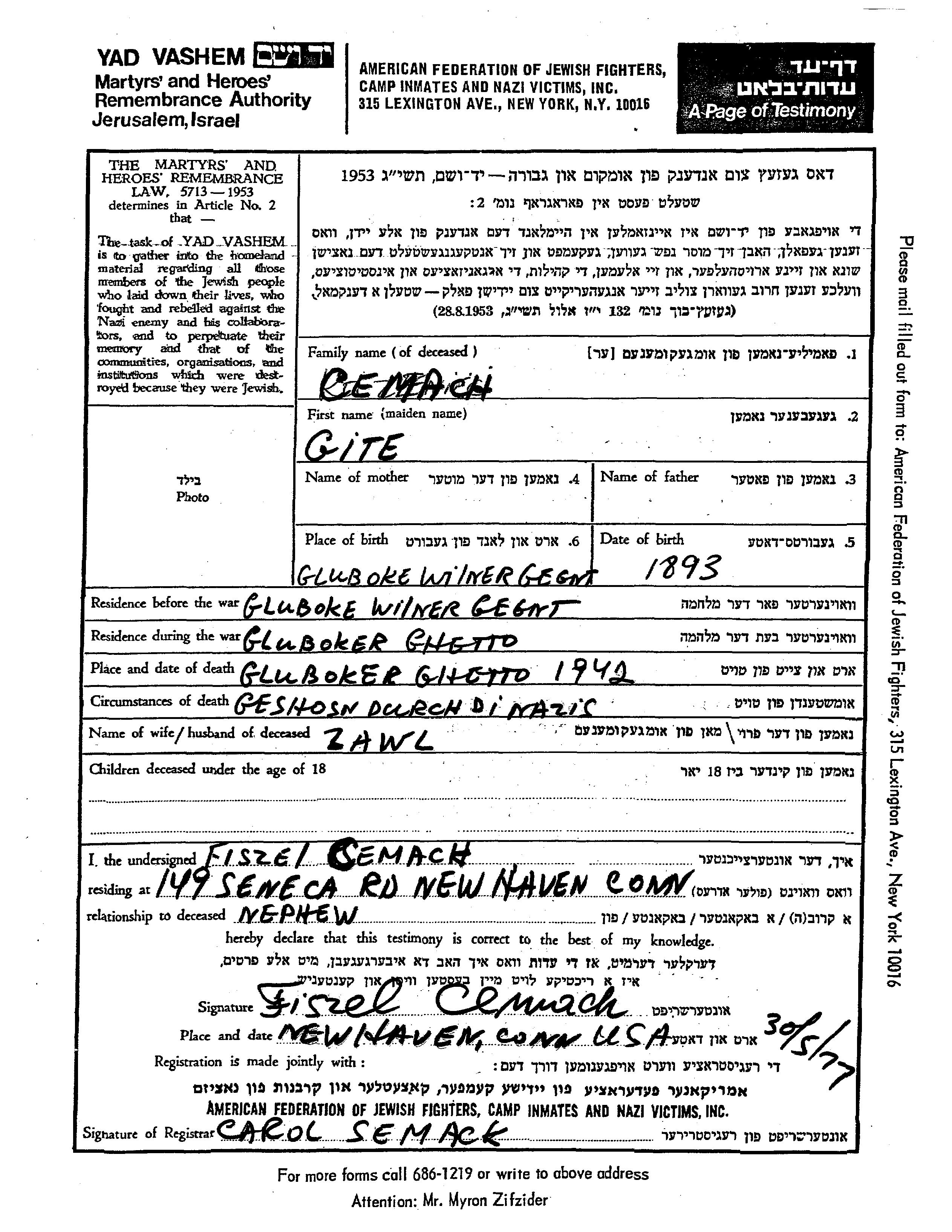 Гите Цемах, место рождения: Глембокие, Польша. Женат / замужем. Место жительства до войны: Глембокие, Польша. Место во время войны: Глембоке, Польша.