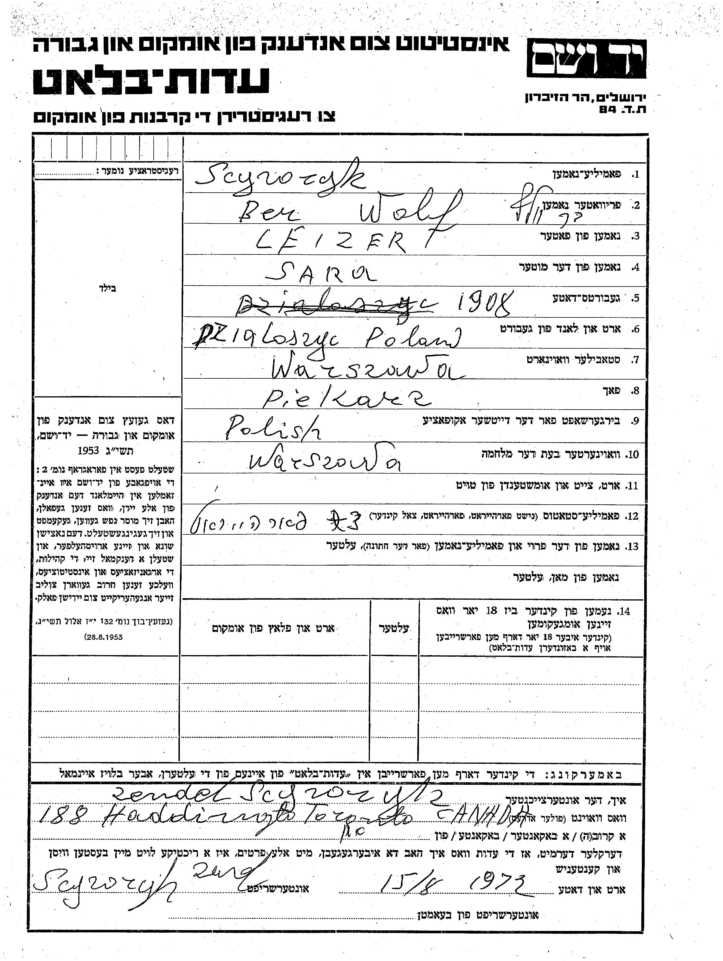 Сцизорик Вольф Бер 1908 Варшава, Польша Лист свидетельских показаний