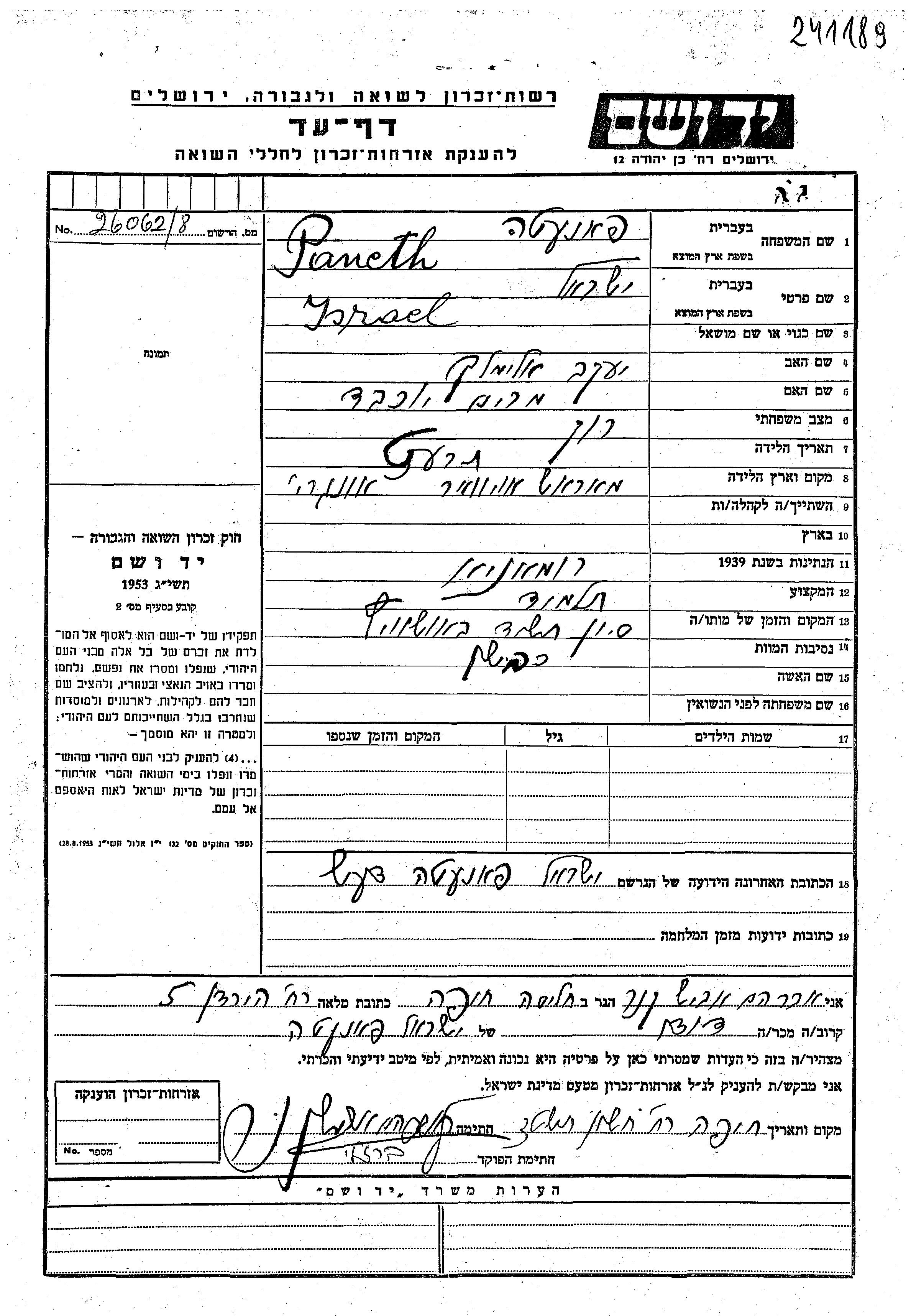 Исраэль Панет, место рождения: Марошуйвар, Румыния. Отец: Яков Элимелех, mать:Мирьям Йохевед. Ученик / ученица. Холост / не замужем. Место во время войны: Румыния.