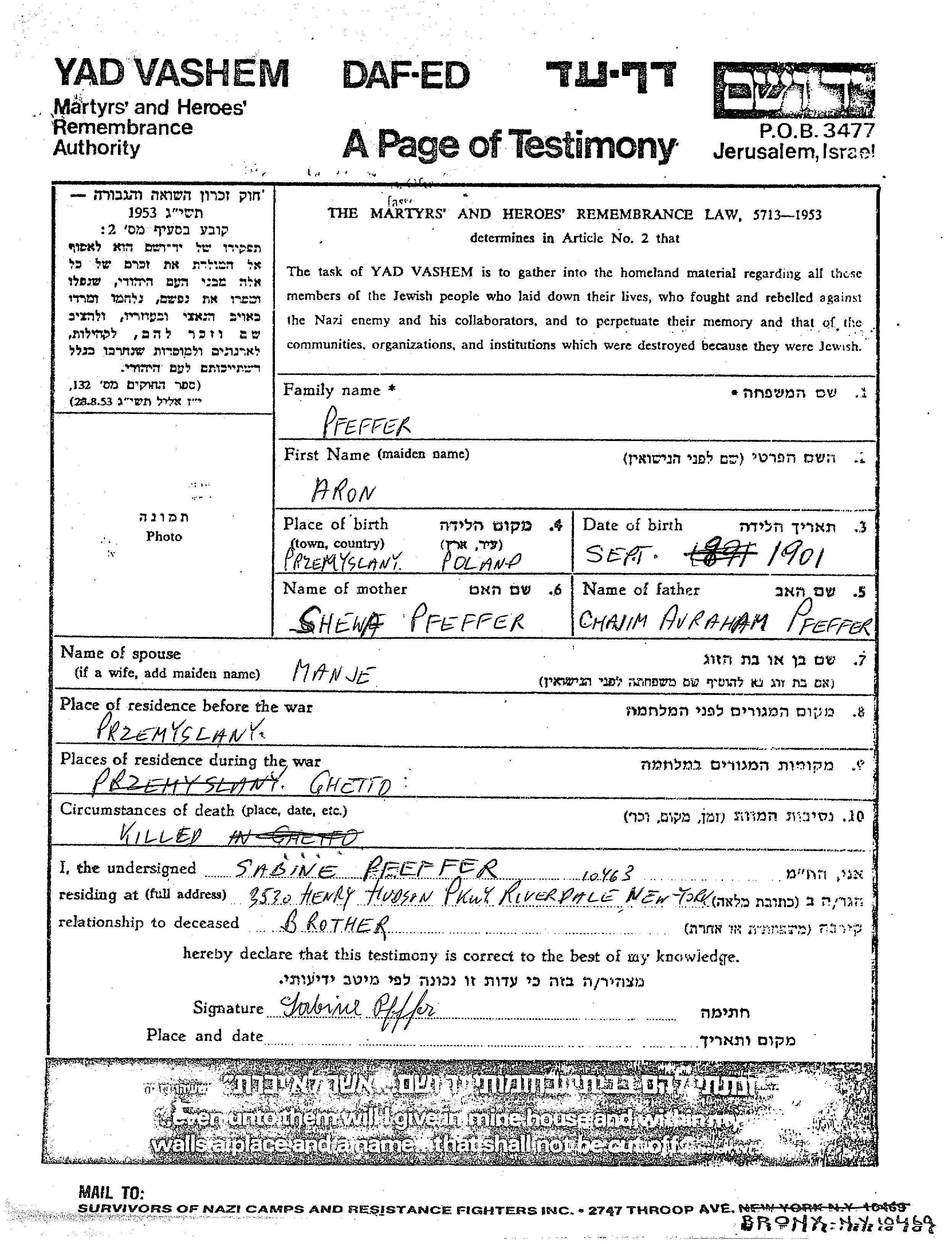 Феффер Арон 1901 Перемышляны, Польша Лист свидетельских показаний