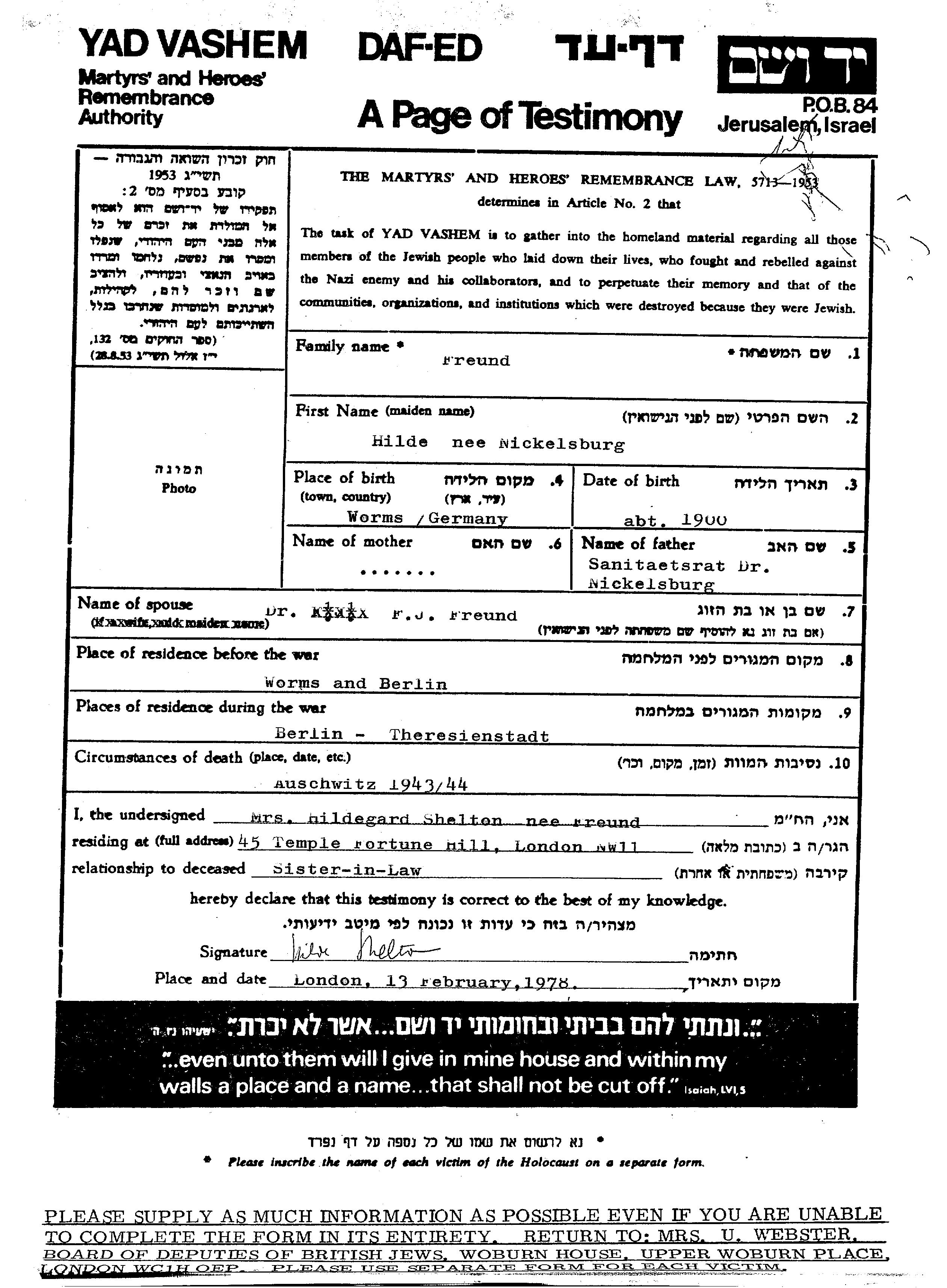 Хильде Фройнд, девичья фамилия Никельсбург, место рождения: Вормс, Германия. Женат / замужем. Место жительства до войны: Берлин, Германия. Место во время войны: Терезиенштадт, Чехословакия.
