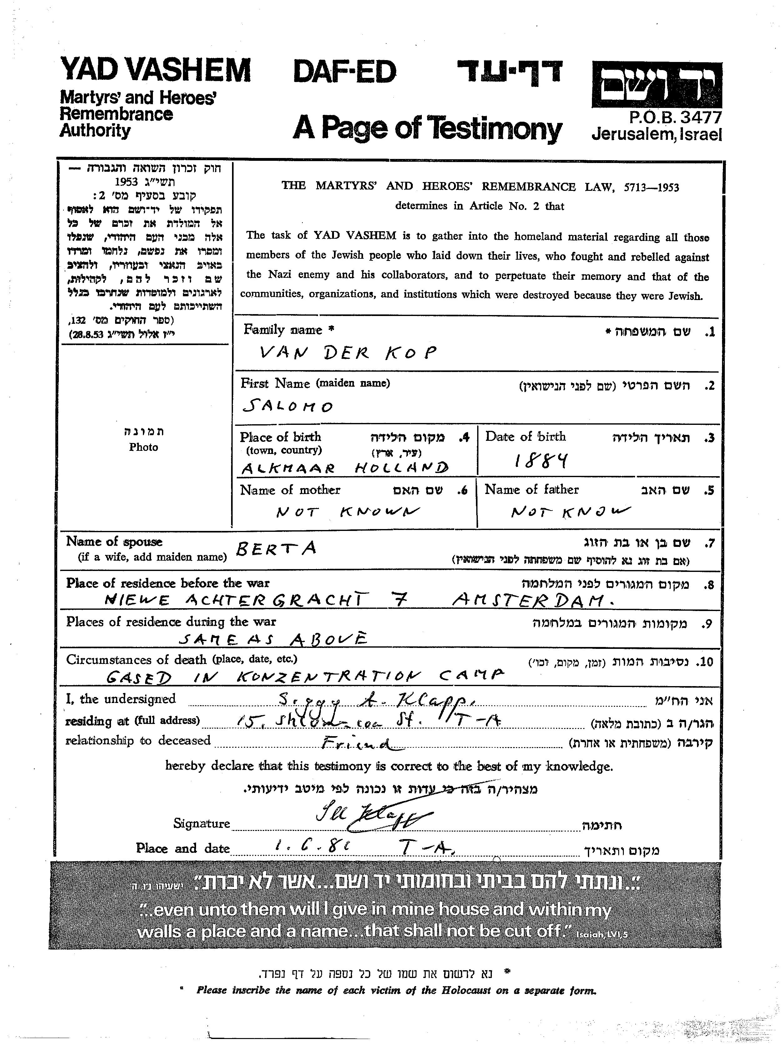 Саломо ван дер Коп, место рождения: Алкмар, Нидерланды. Женат / замужем. Место жительства до войны: Амстердам, Нидерланды. Место во время войны: Амстердам, Нидерланды.