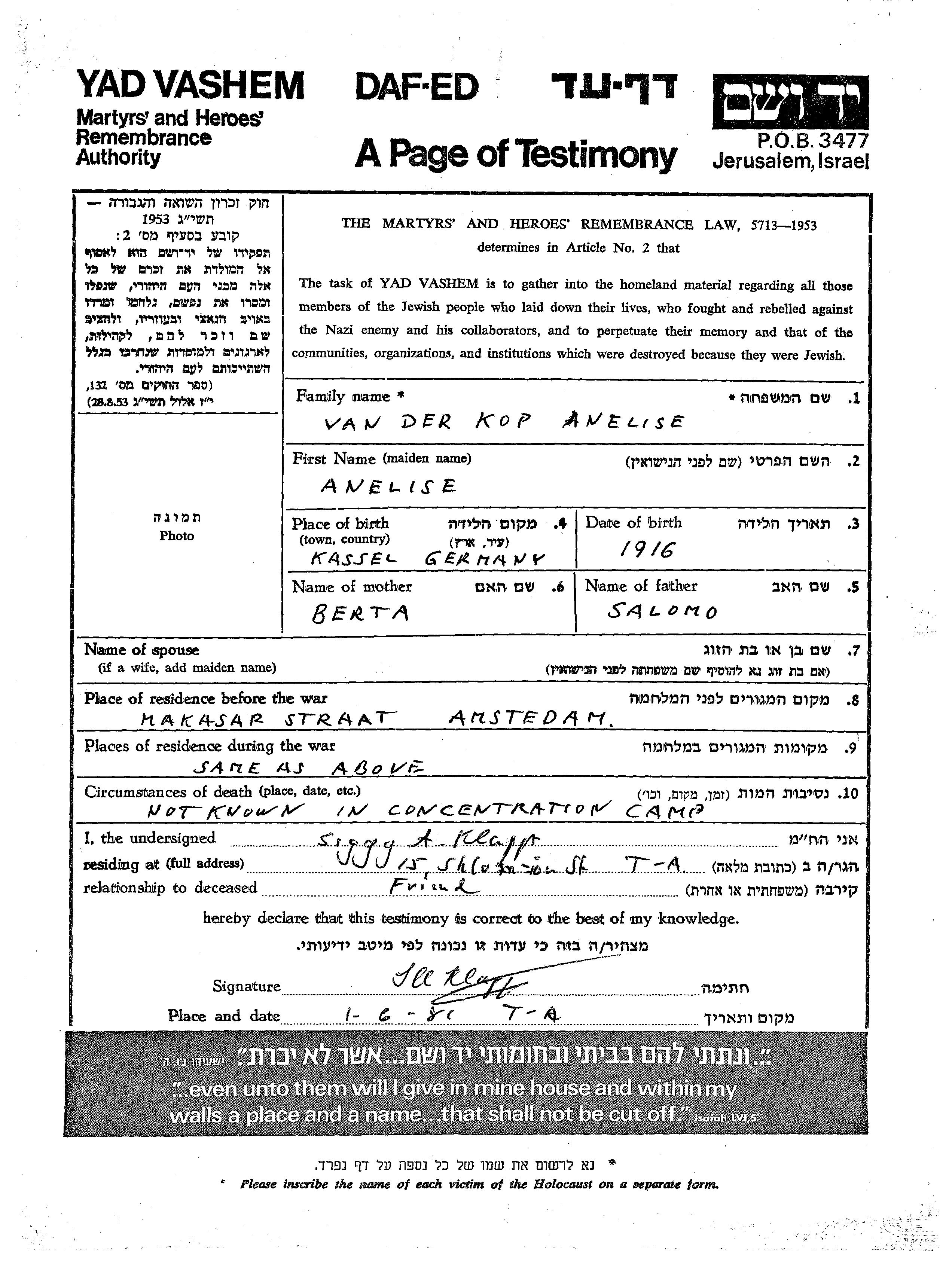 Анелизе ван дер Коп, место рождения: Кассель, Германия. Отец: Саломо, mать:Берта. Место жительства до войны: Амстердам, Нидерланды. Место во время войны: Амстердам, Нидерланды.