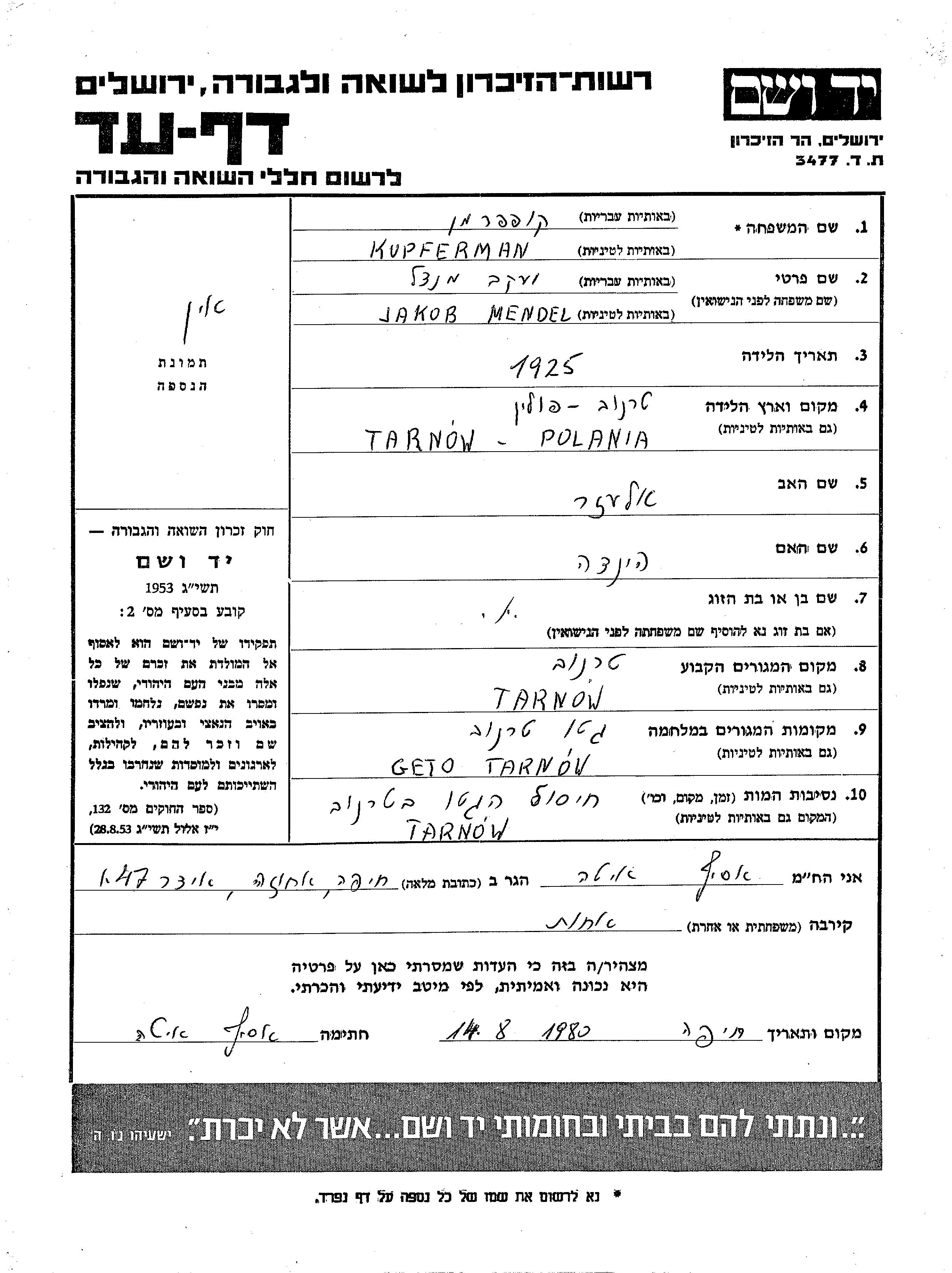 Якоб Мендель Купферман, место рождения: Тарнув, Польша. Отец: Элазар, mать:Хинда. Место жительства до войны: Тарнув, Польша. Место во время войны: Тарнув, Польша.