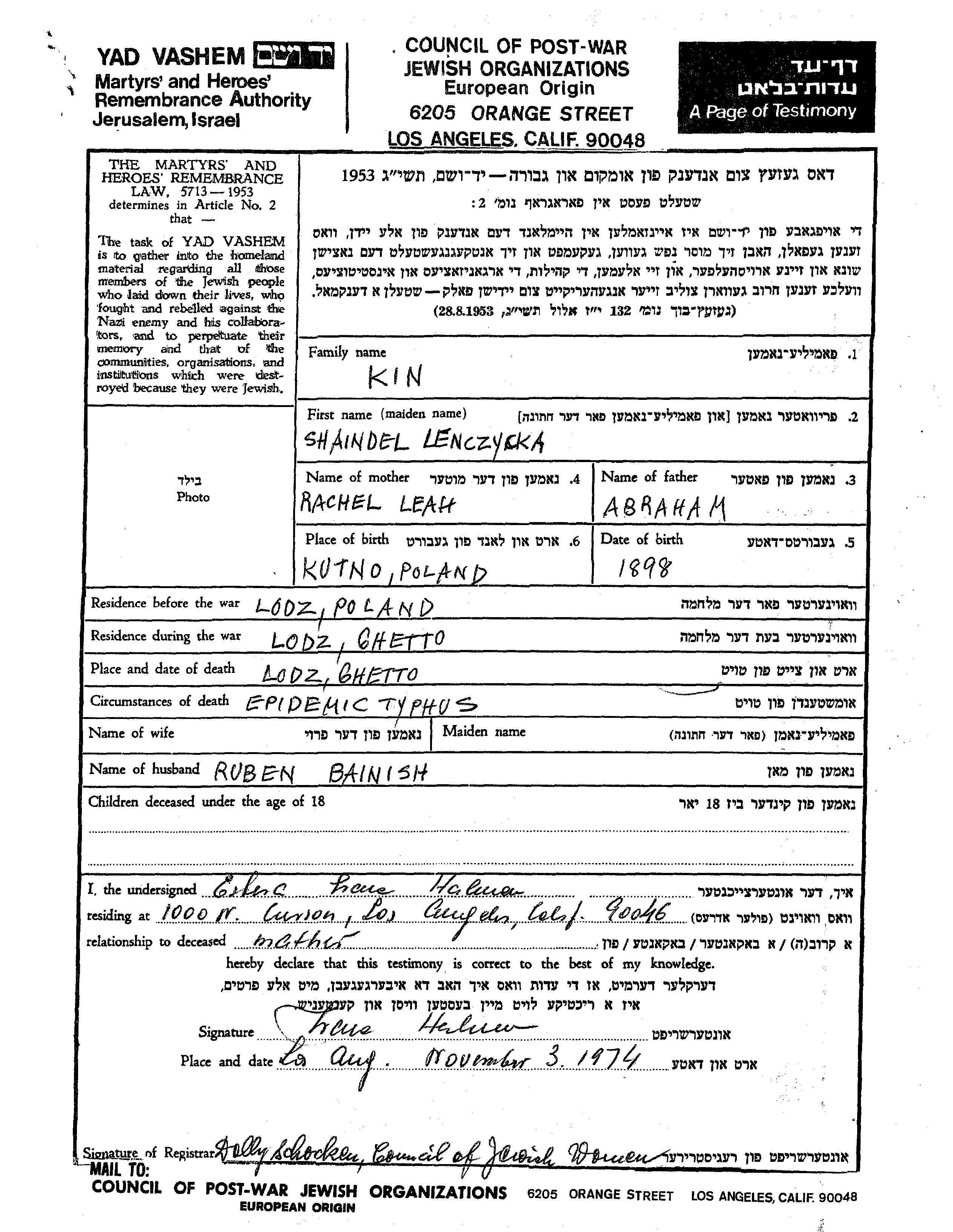 Шайндел Кин, девичья фамилия Ленчицка, место рождения: Кутно, Польша. Отец: Абраам, mать:Рахель Лея. Место жительства до войны: Лодзь, Польша. Место во время войны: Лодзь, Польша.