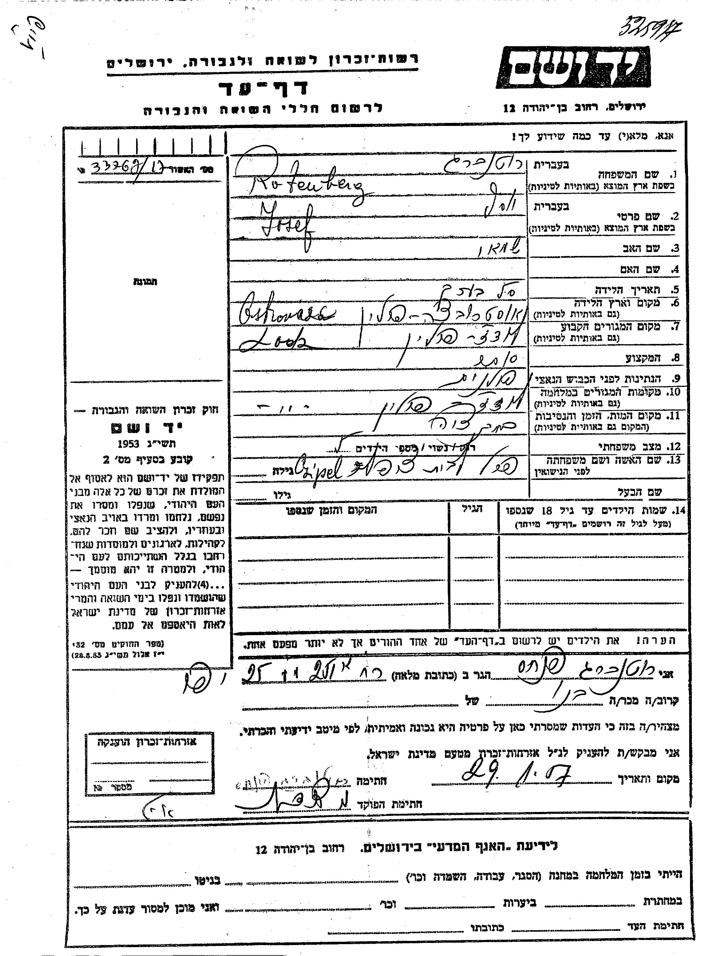 Йосеф Ротенберг, место рождения: Островец, Польша. Отец: Шамай. Торговец / торговка. Женат / замужем. Место жительства до войны: Лодзь, Польша. Место во время войны: Лодзь, Польша.