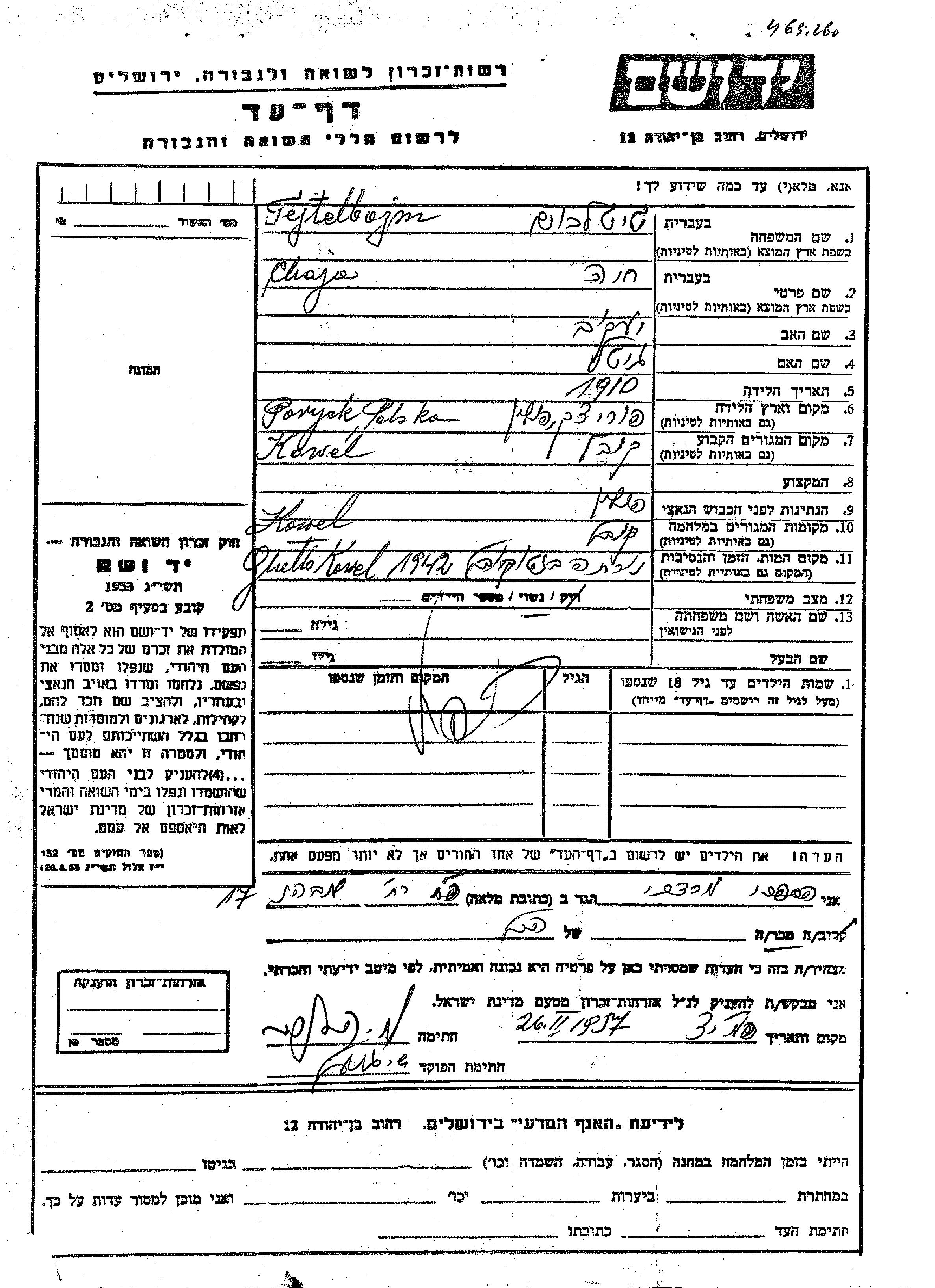 Тейтельбойм Хая 1910 Ковель, Польша Лист свидетельских показаний
