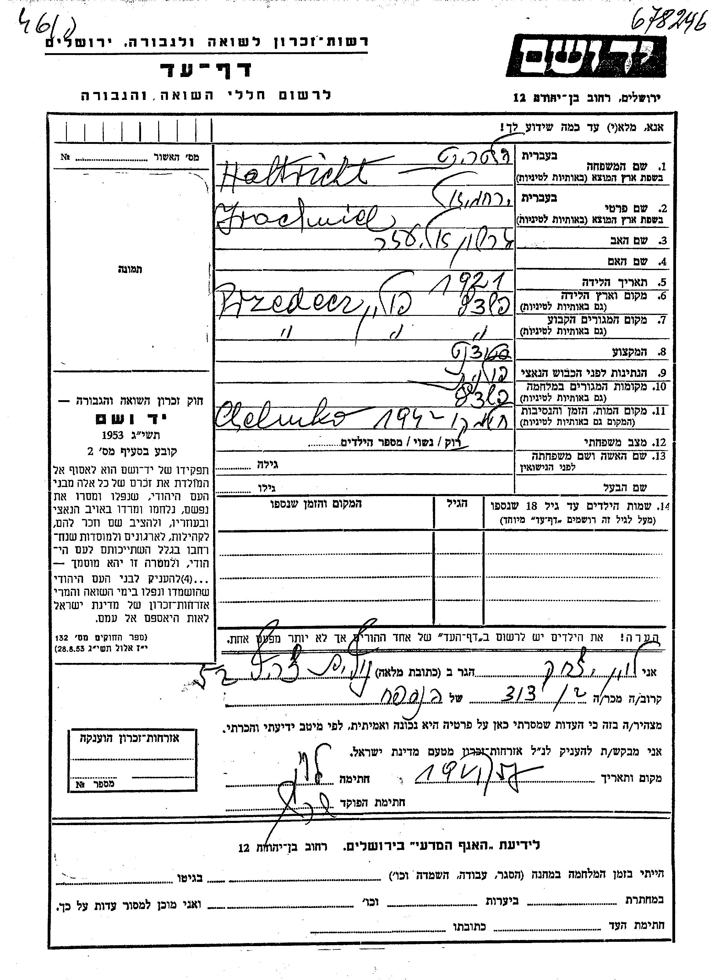 Иерахмиэль Хальтрихт, место рождения: Пшедеч, Польша. Отец: Гершон Элиэзер. Студент / студентка. Холост / не замужем. Место жительства до войны: Пшедеч, Польша. Место во время войны: Пшедеч, Польша.
