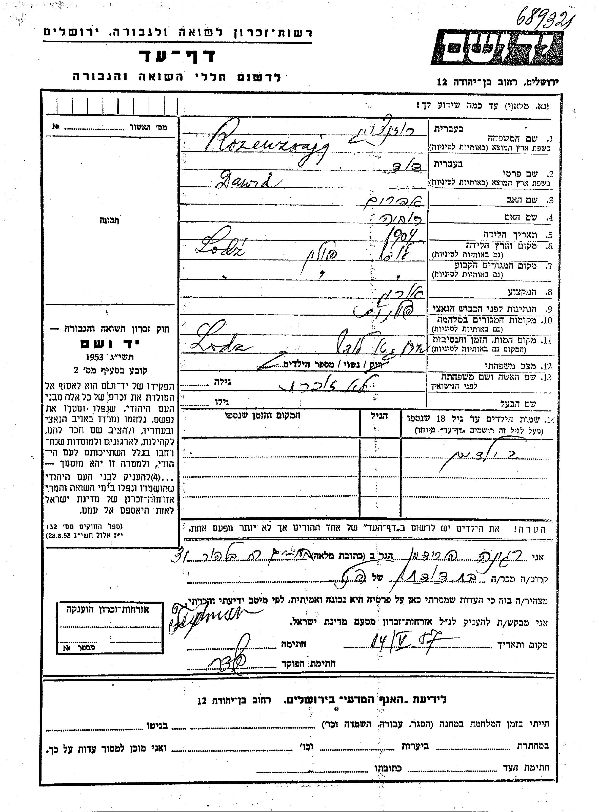 Давид Розенцвайг, место рождения: Лодзь, Польша. Отец: Эфраим, mать:Рувия. Ткач / ткачиха. Место жительства до войны: Лодзь, Польша. Место во время войны: Лодзь, Польша.