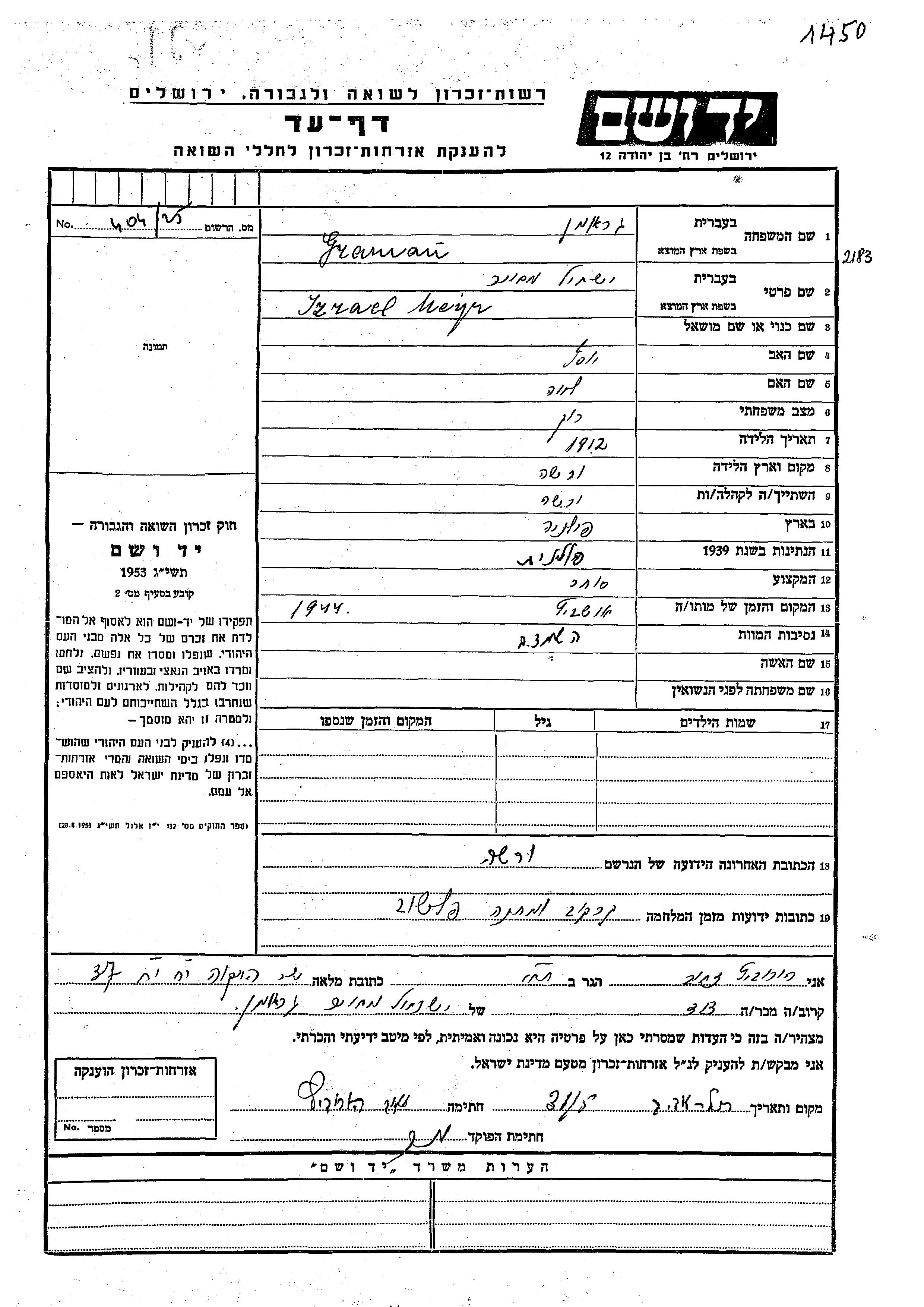 Израэль Меир уничтожен в период Шоа. место смерти: Аушвиц, Польша в 1944.