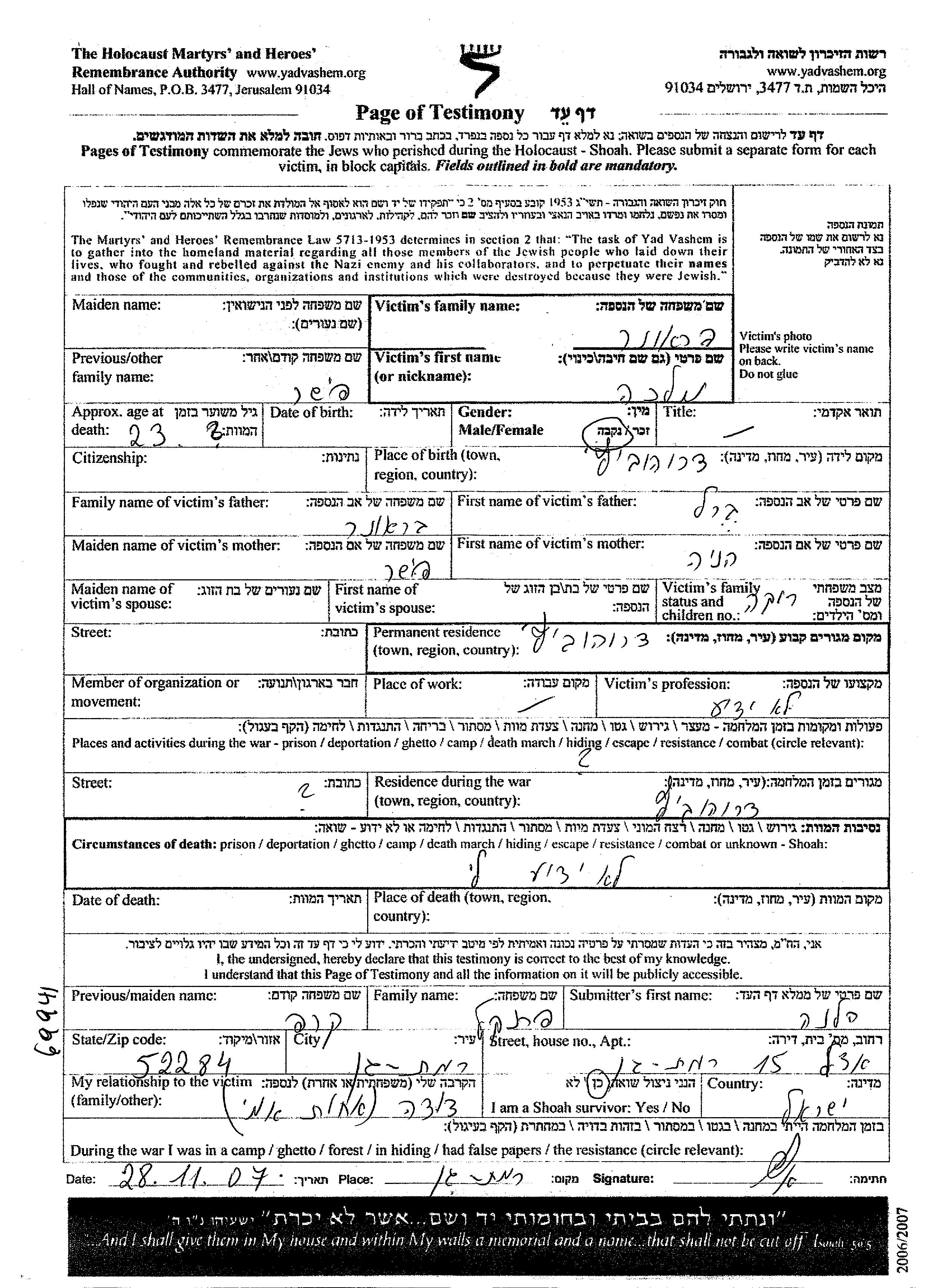 Яд Вашем - Листы свидетельских показаний Мемориального фонда
