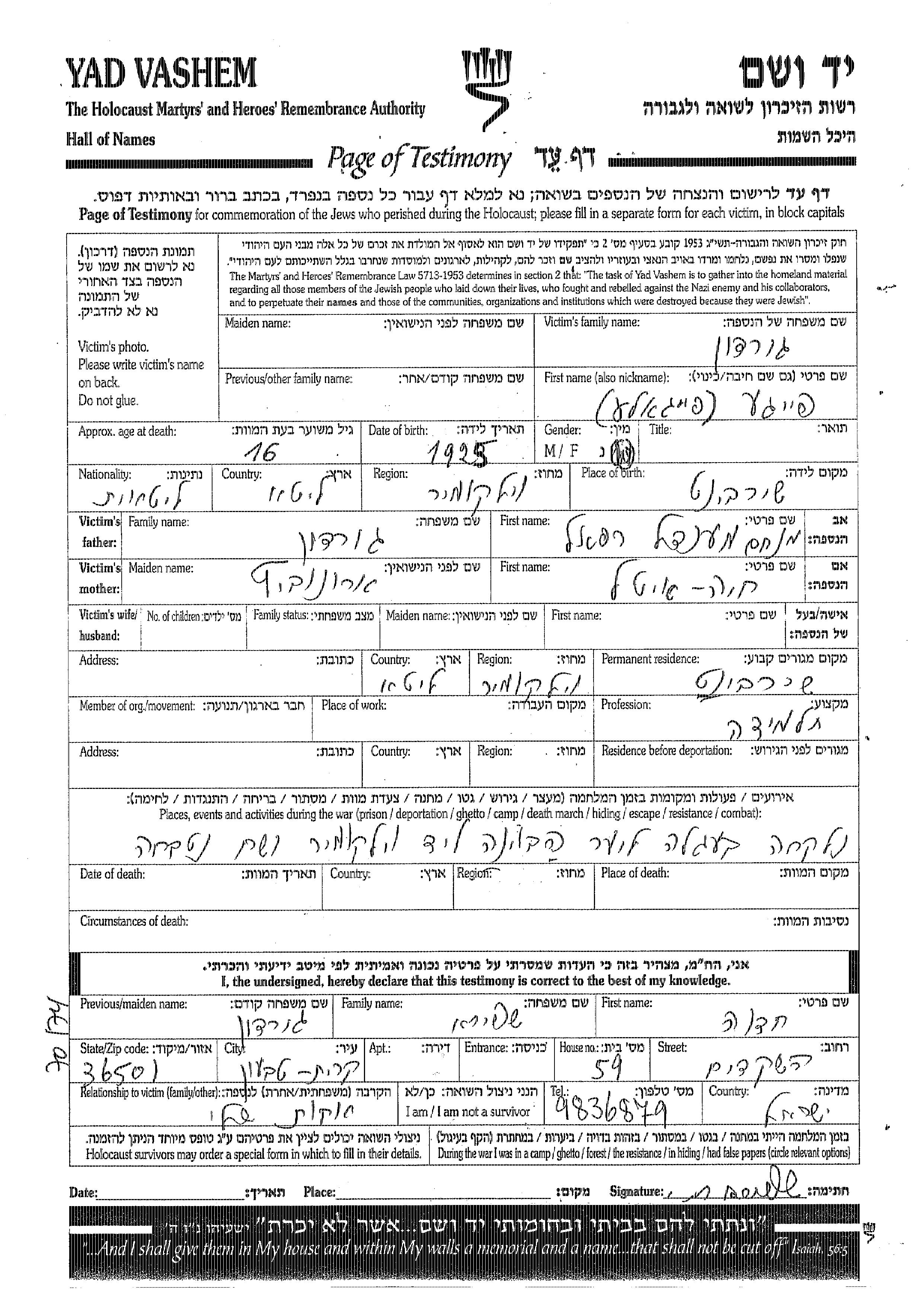 Яд Вашем - Листы свидетельских показаний Мемориального фонда