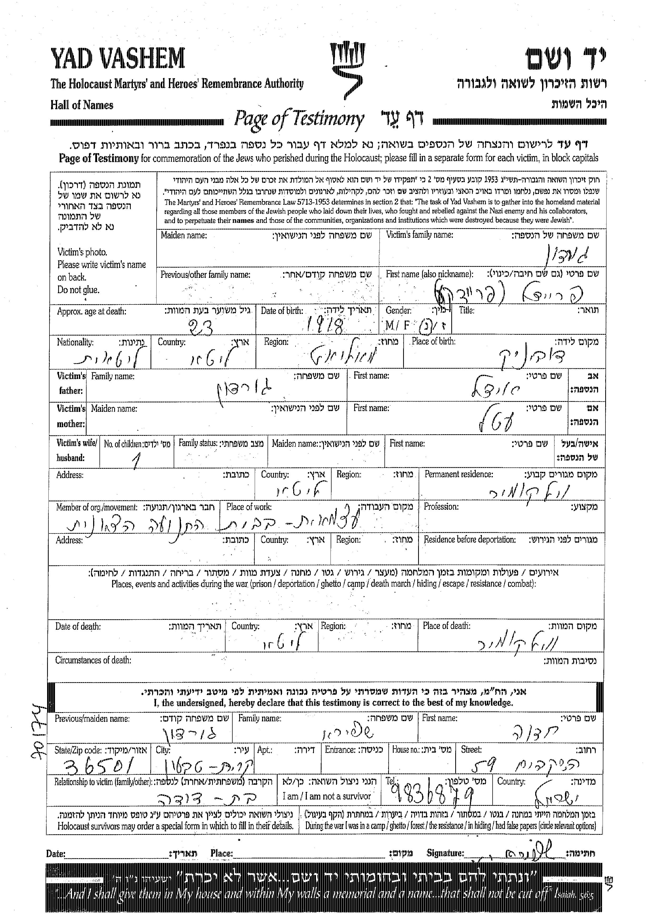 Яд Вашем - Листы свидетельских показаний Мемориального фонда