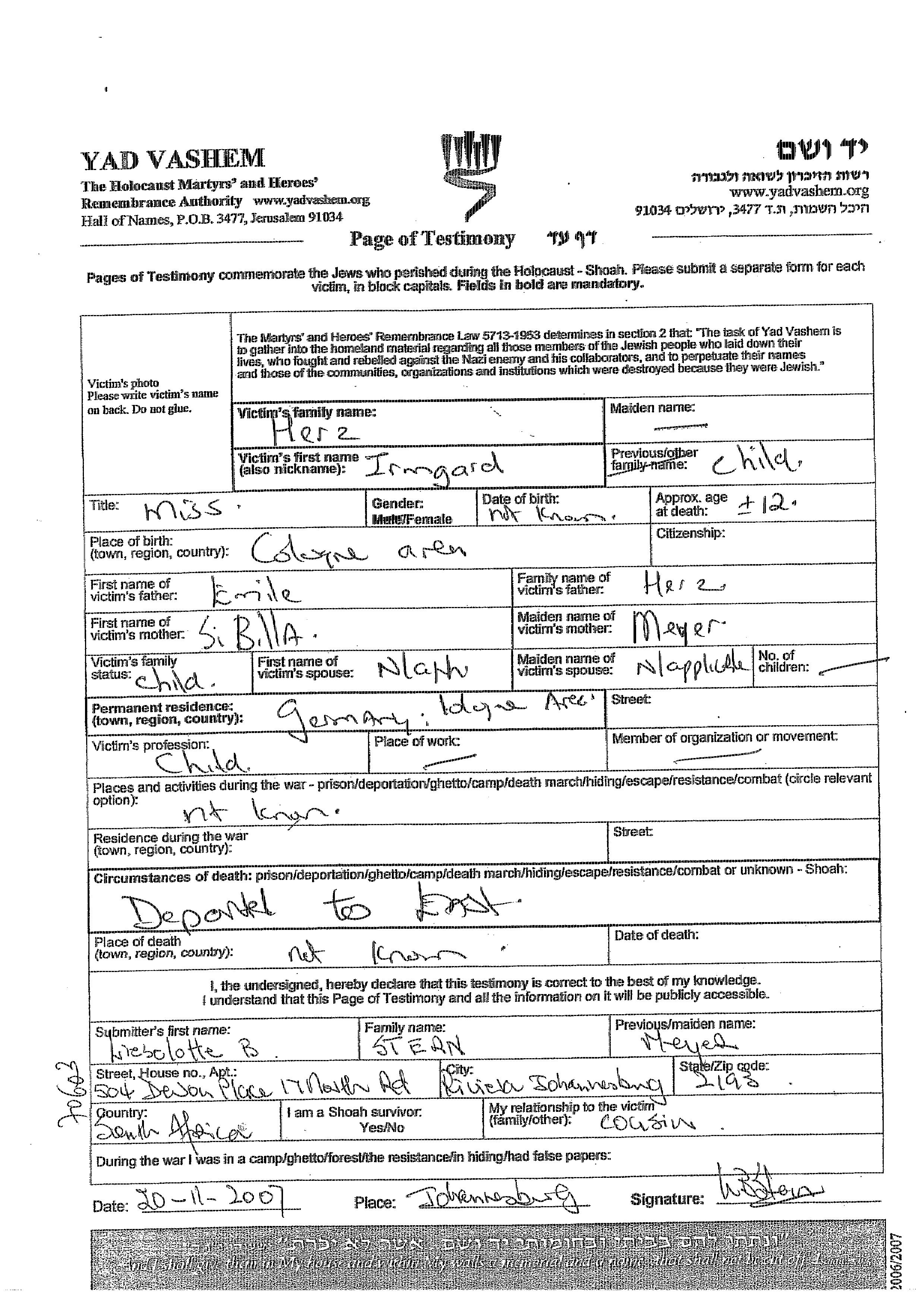 Ирмгард Херц родился/родилась, место рождения: <> (Кёльн), Германия. Отец: Эмиль, mать:Сибилла, девичья фамилия Мейер. Ребенок. Место жительства до войны: <> (Кёльн), Германия.