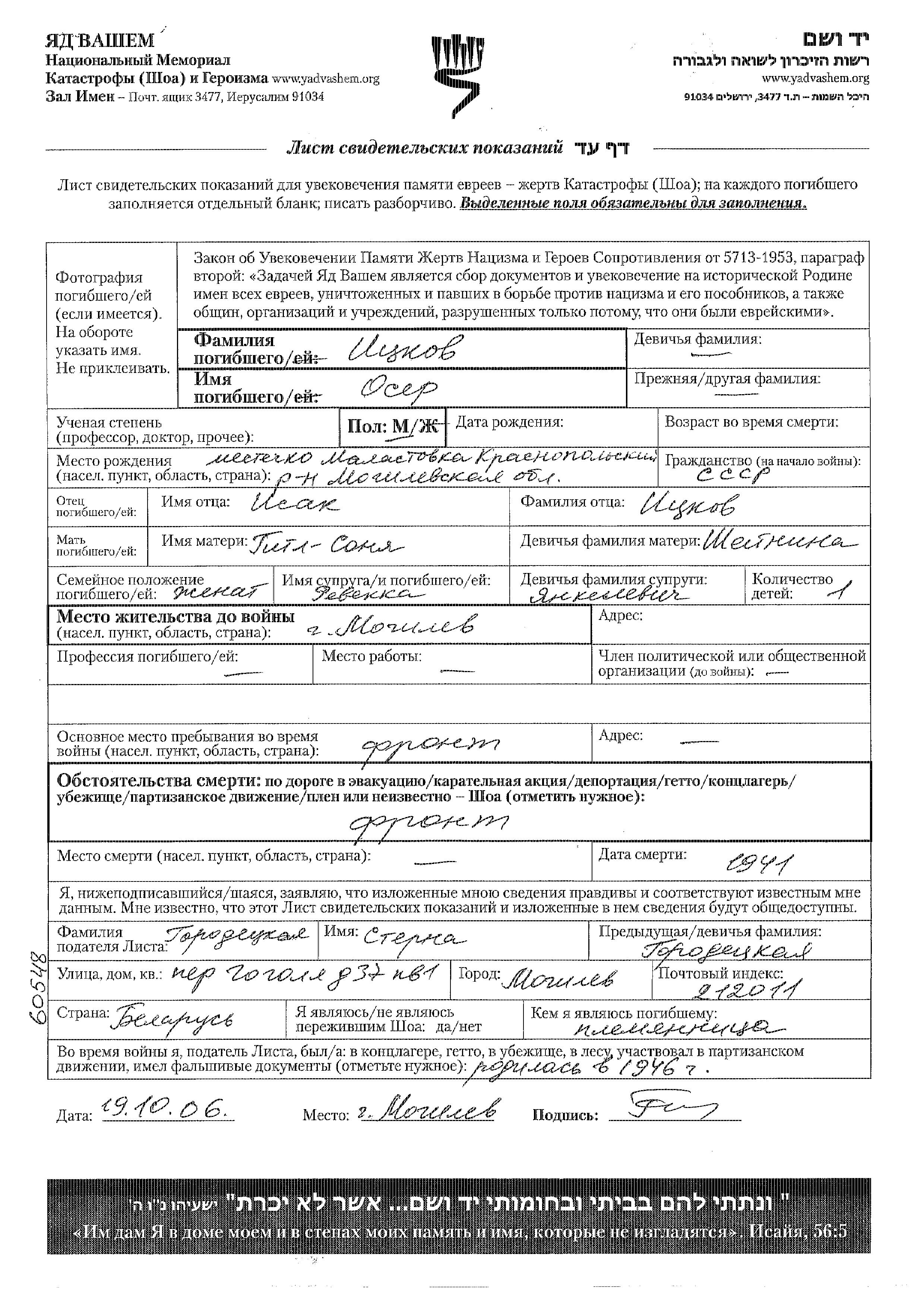 Ицков Осер Могилёв, Белоруссия (СССР) Лист свидетельских показаний