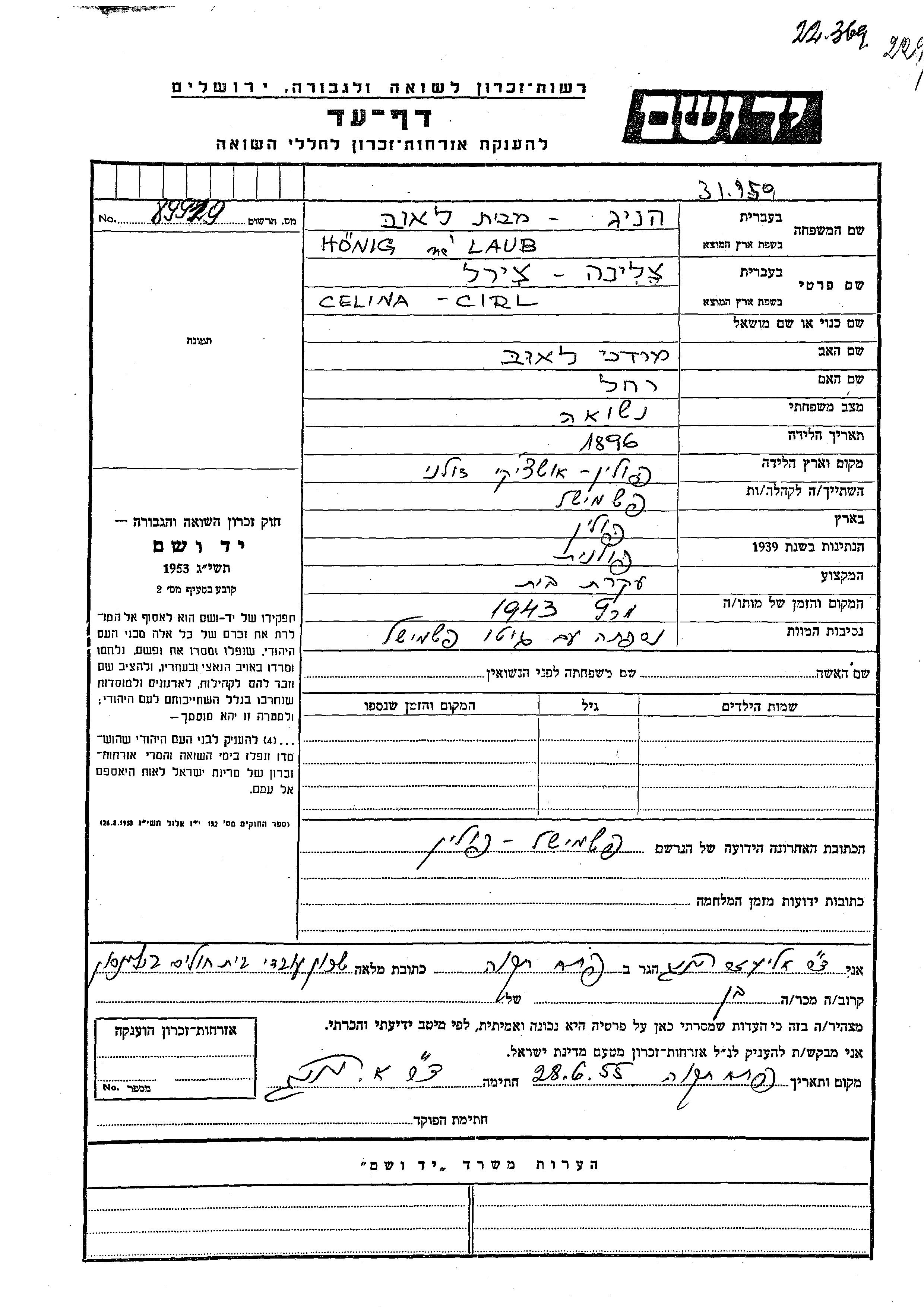Цирл Целина Хониг, девичья фамилия Лауб, место рождения: Uszczyki Dolne, Польша. Отец: Мордехай, mать:Рахель. Домохозяйка. Женат / замужем. Место жительства до войны: Пшемысль, Польша.