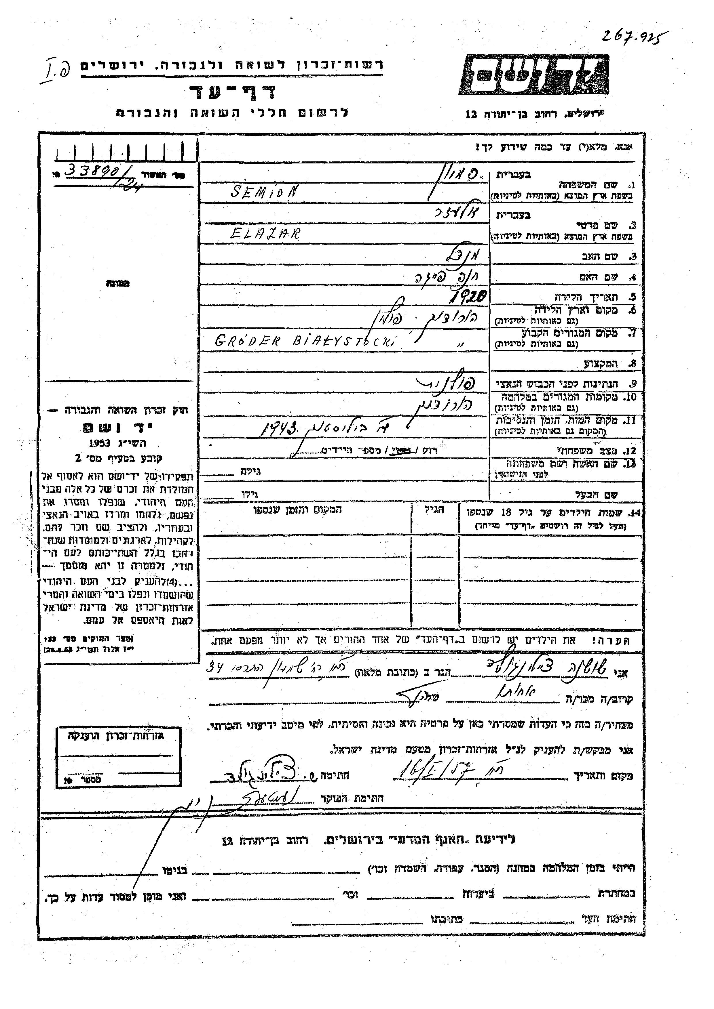 Элазар Семион, место рождения: Хородек, Польша. Отец: Мендель, mать:Хана Фейга. Холост / не замужем. Место жительства до войны: Грудек, Польша. Место во время войны: Хородек, Польша.