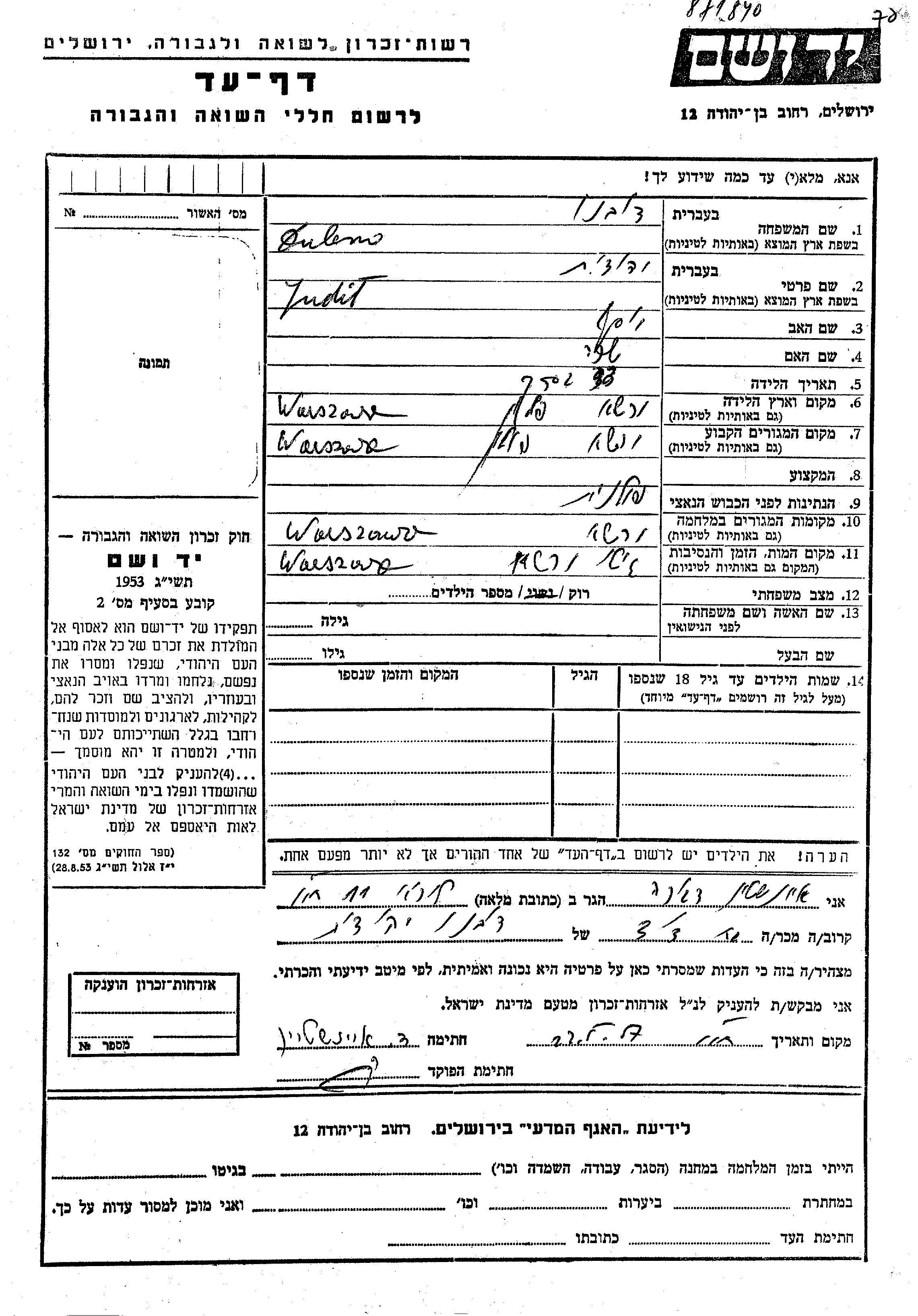 Дубно Юдит Варшава, Польша Лист свидетельских показаний