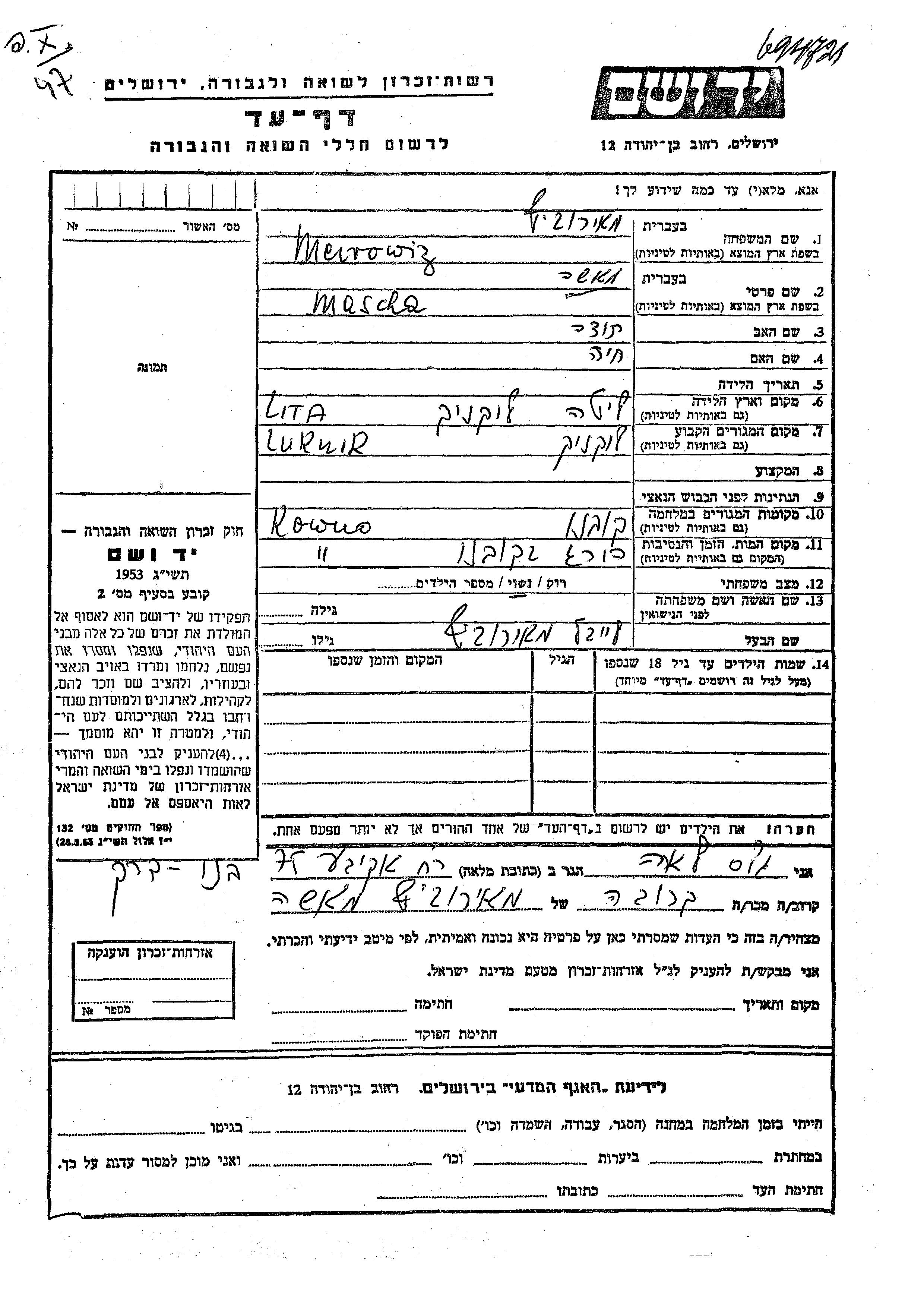 Маша Меировиц, место рождения: Лукники, Литва. Отец: Тода, mать:Хая. Женат / замужем. Место жительства до войны: Лукники, Литва. Место во время войны: Каунас, Литва.