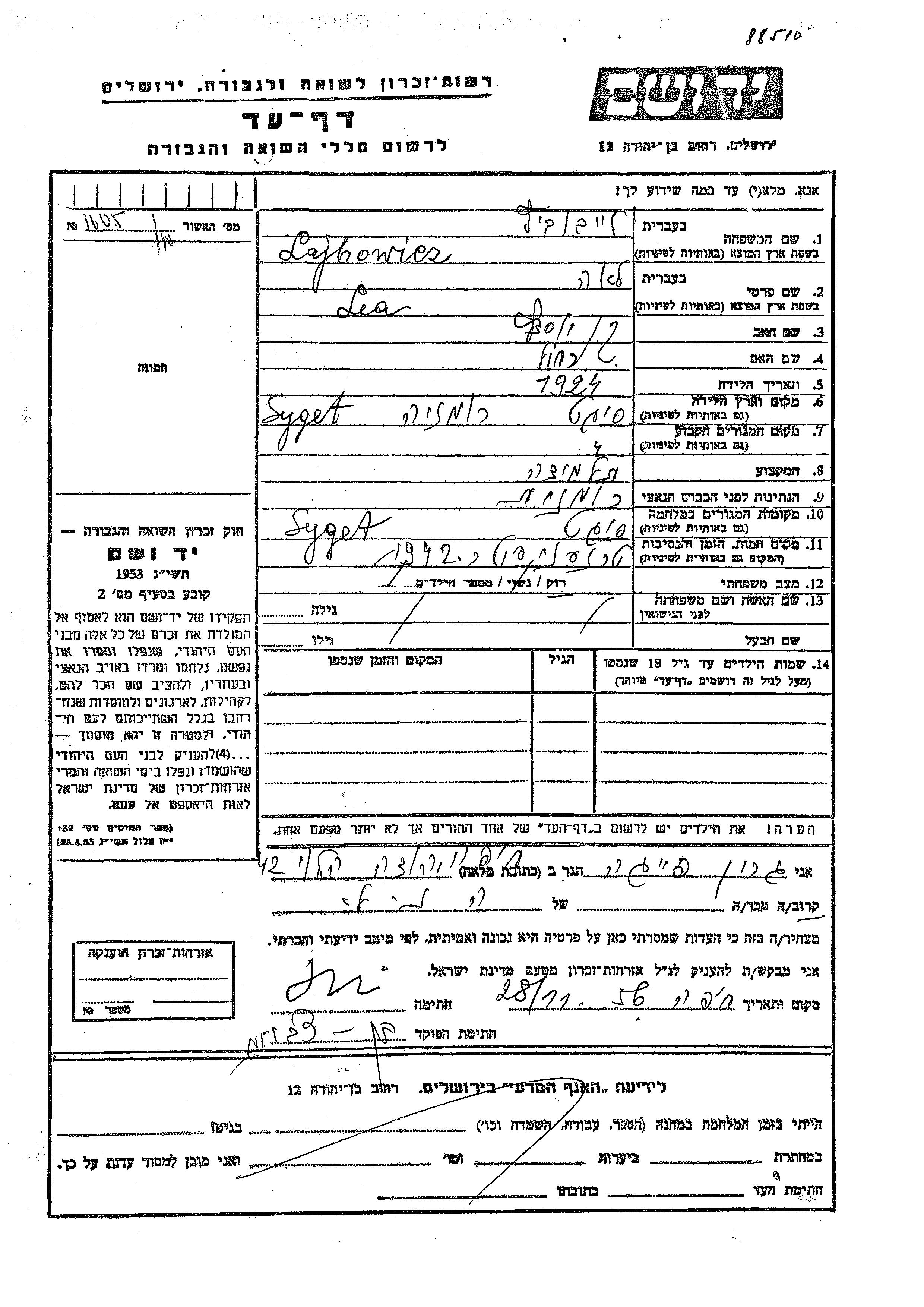 Лайбович Лея 1924 Сигет, Румыния Лист свидетельских показаний