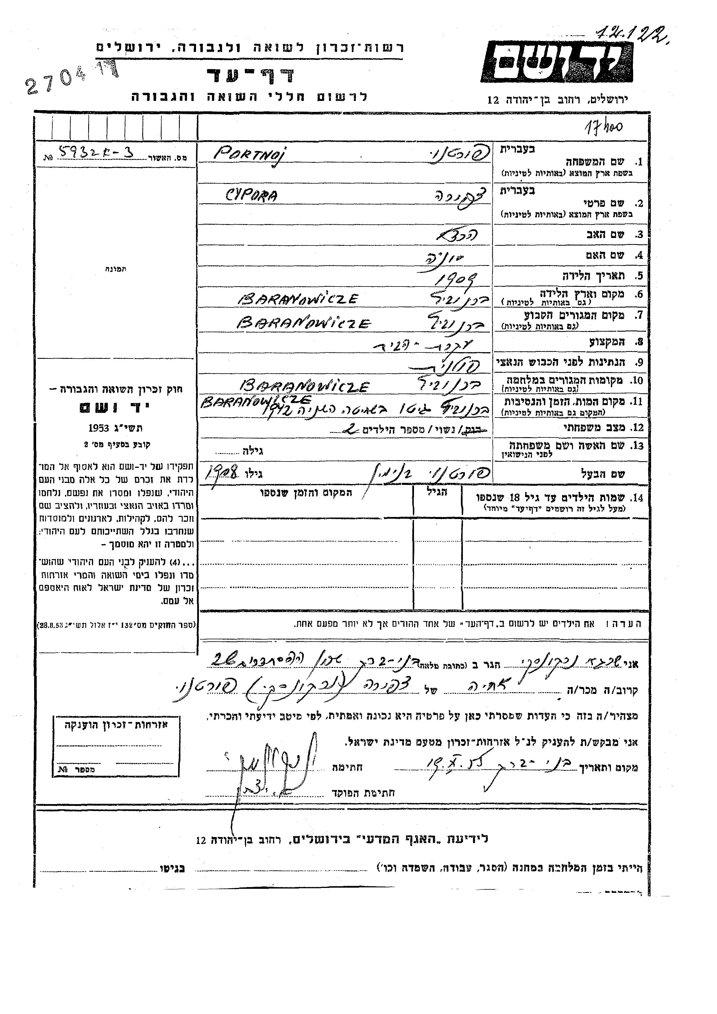 Ципора Портной Портено, место рождения: Барановичи, Польша. Отец: Херцль, mать:Соня. Домохозяйка. Женат / замужем. Место жительства до войны: Барановичи, Польша. Место во время войны: Барановичи, Польша.