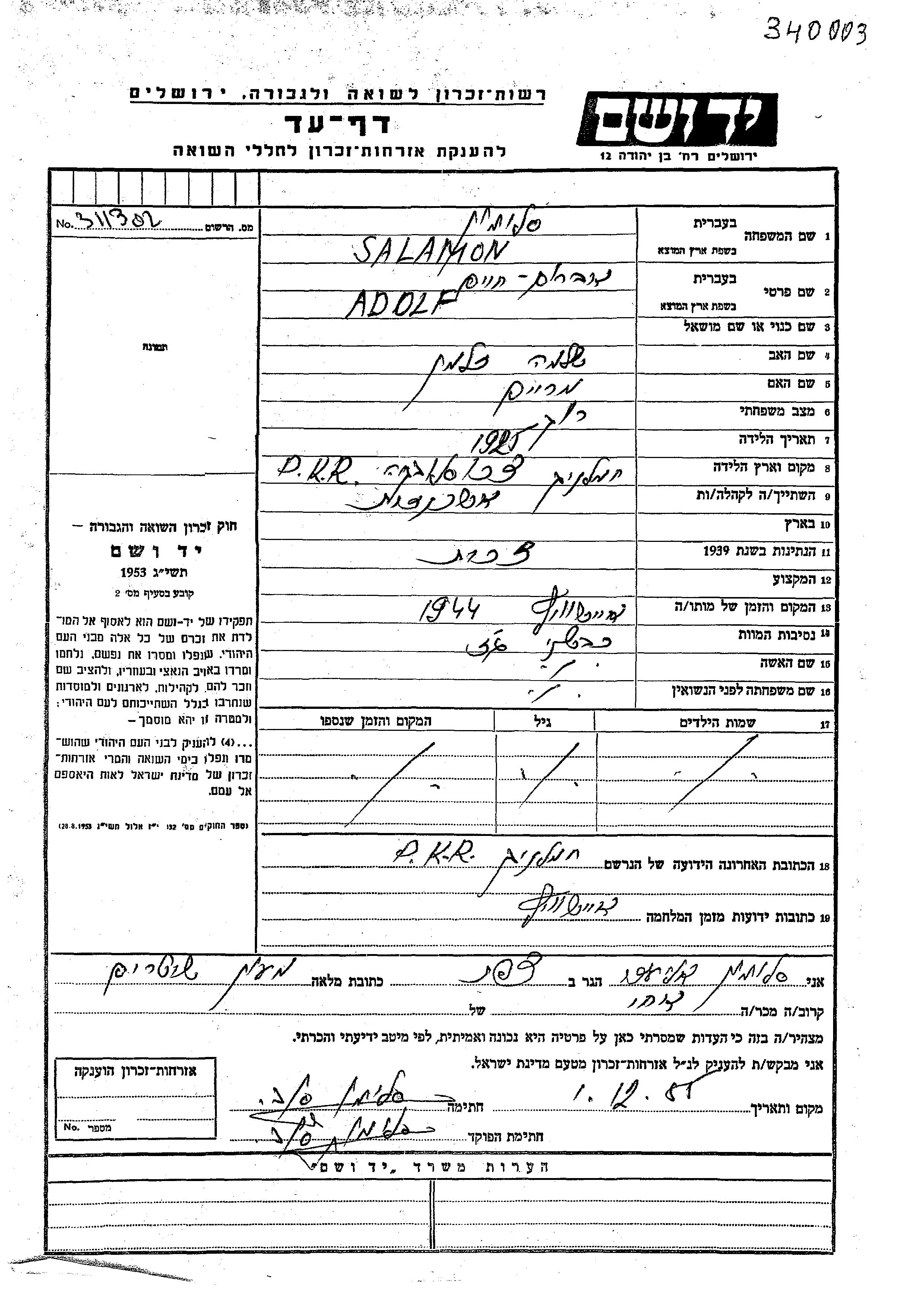 Адольф Авраам Хаим Саламон, место рождения: Хмельник, Чехословакия. Отец: Шломо Залман, mать:Мирьям. Холост / не замужем. Место жительства до войны: Хмельник, Чехословакия. Место во время войны: Аушвиц, Польша.