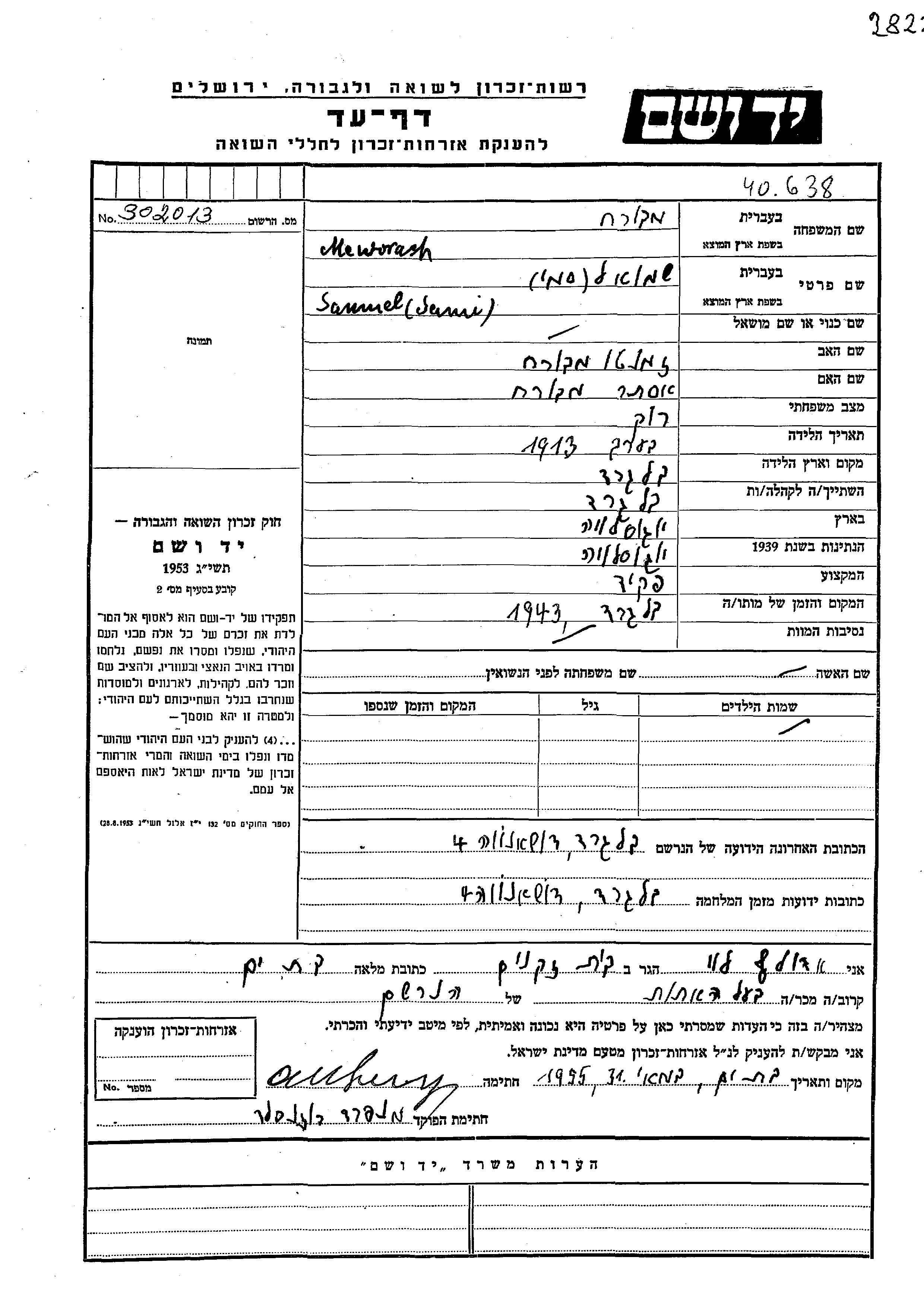 Сами Меворах, место рождения: Белград, Югославия. Отец: Земанто, mать:Эстер. Клерк. Холост / не замужем. Место жительства до войны: Белград, Югославия. Место во время войны: Белград, Югославия.