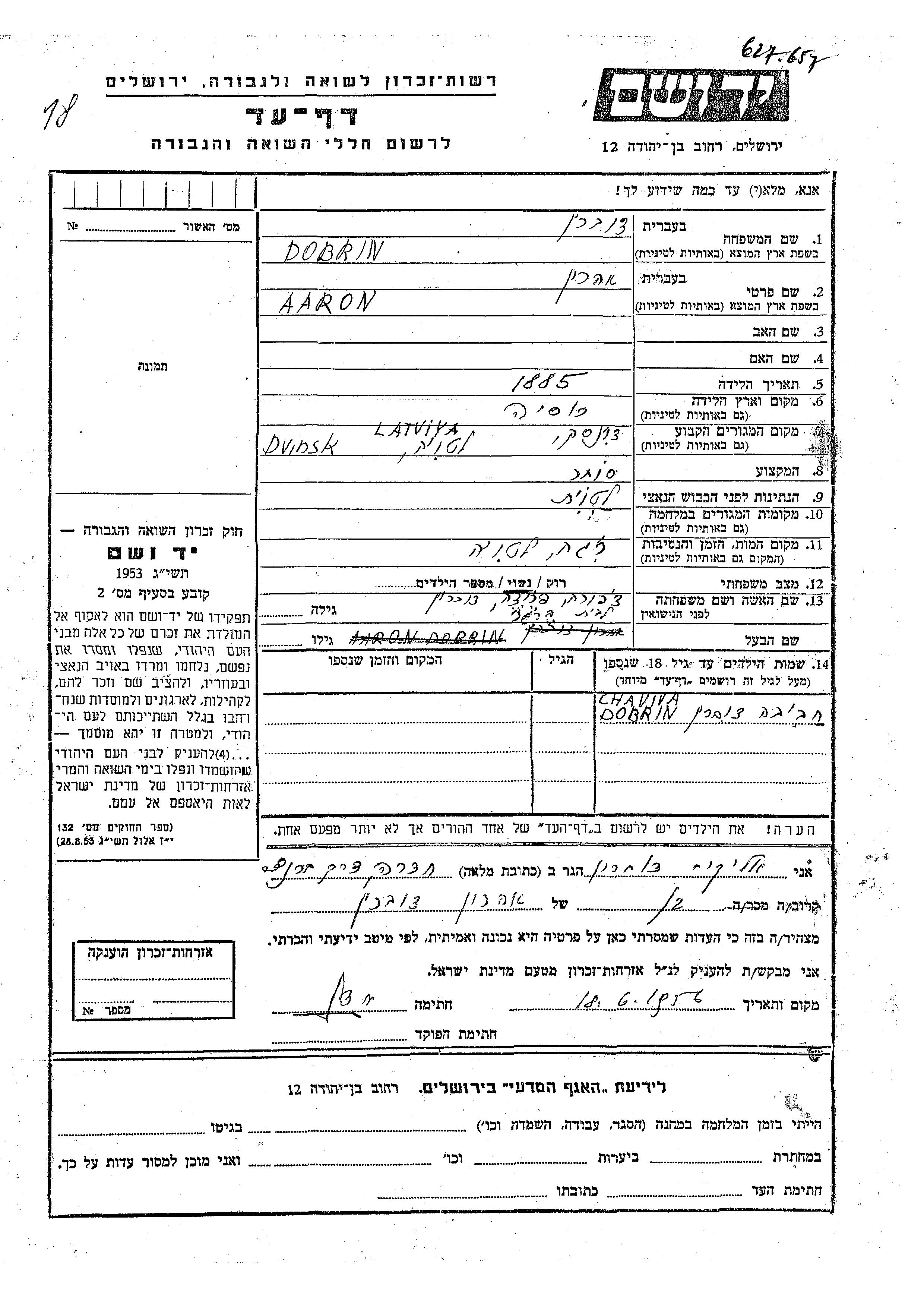Аарон Добрин, место рождения: Россия (СССР). Торговец / торговка. Женат / замужем. Место жительства до войны: Двинск, Латвия.