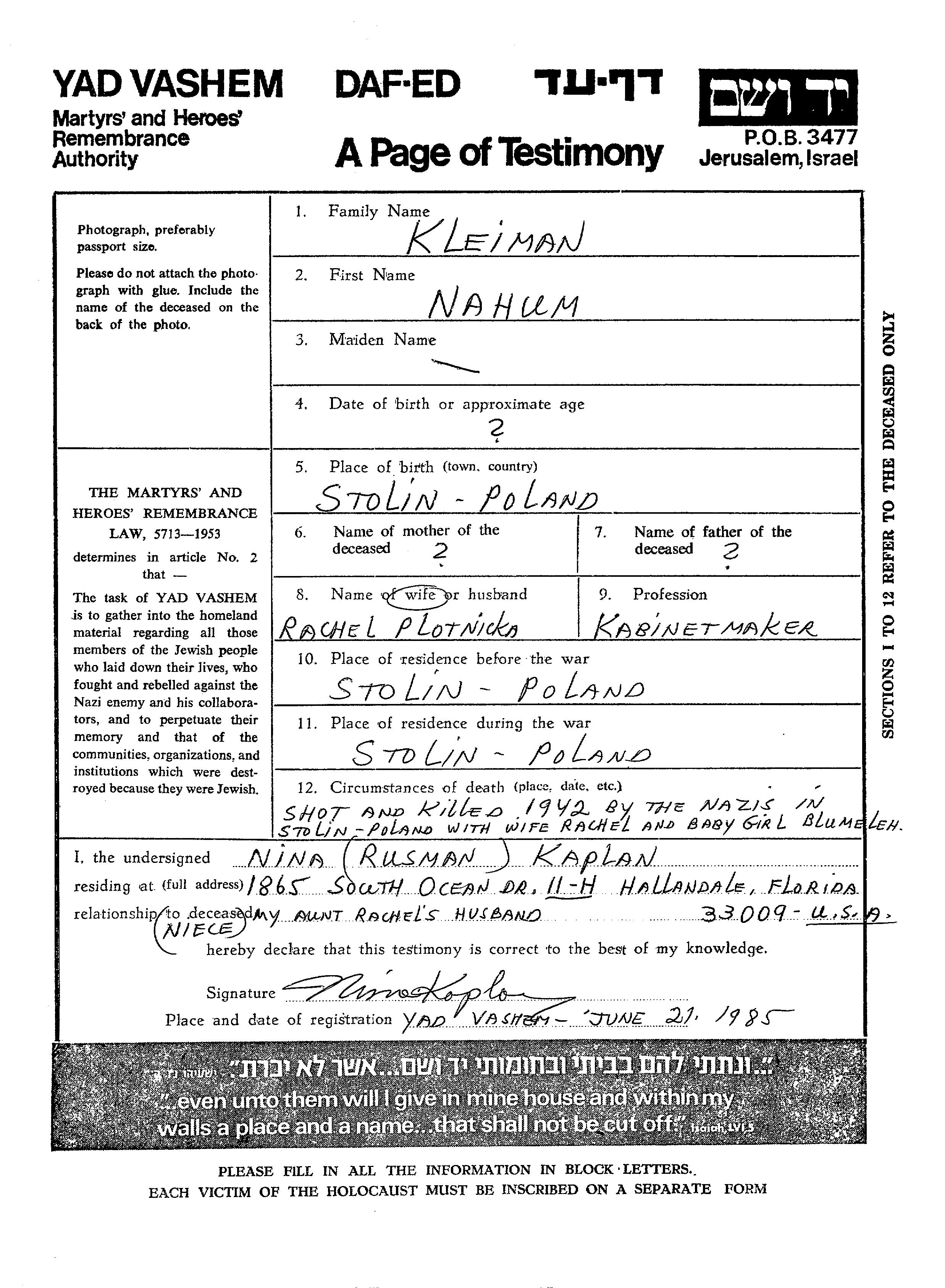 Клейман Нахум Столин, Польша Лист свидетельских показаний