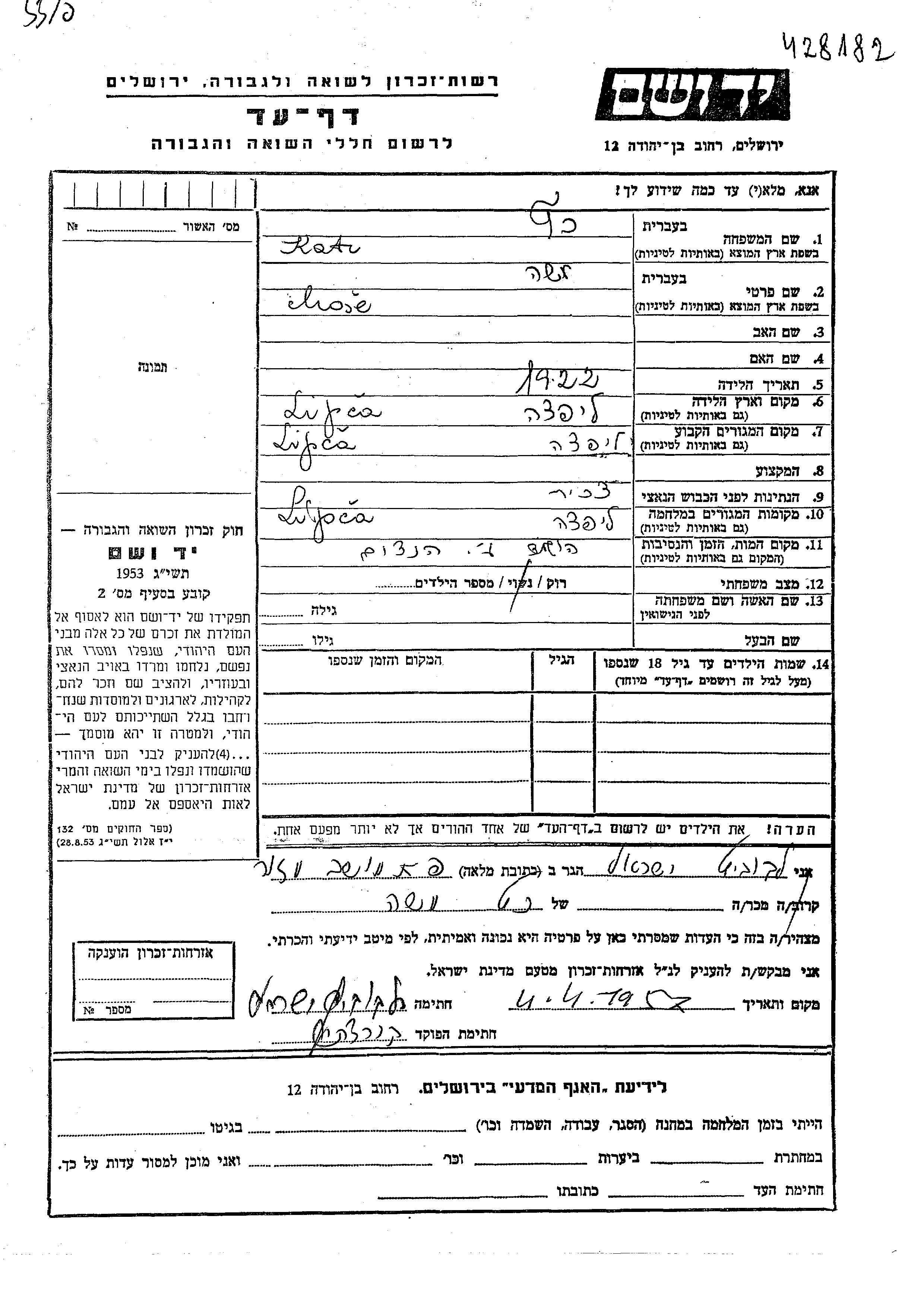 Кац Моше 1922 Липча, Чехословакия Лист свидетельских показаний