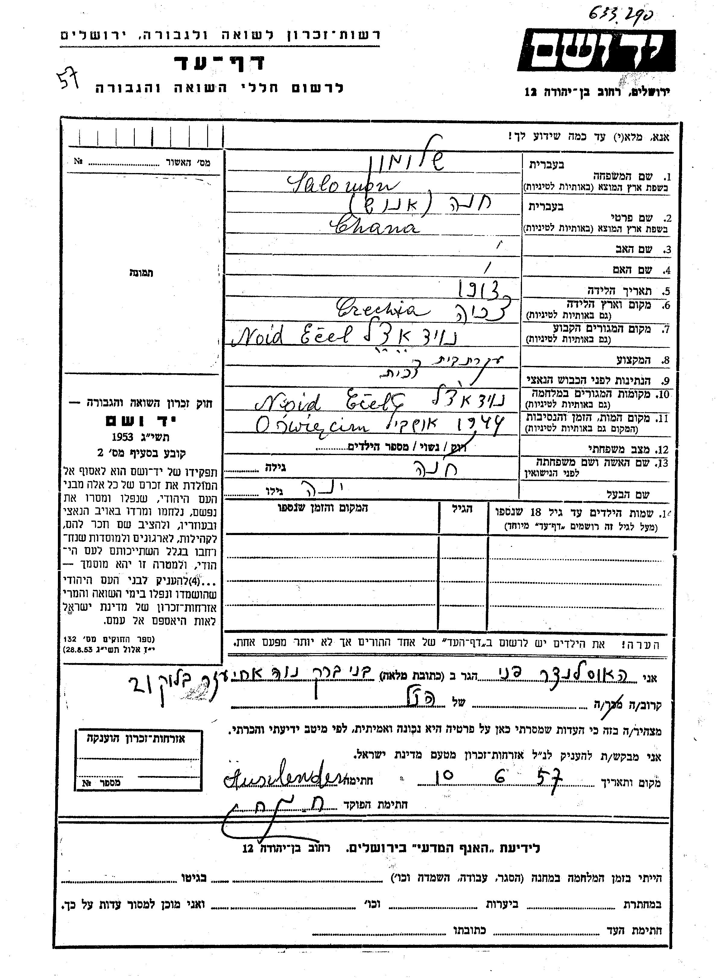 Хана Ануш Саломон, место рождения: Чехословакия. Домохозяйка. Женат / замужем. Место жительства до войны: Надь Эчед, Венгрия. Место во время войны: Надь Эчед, Венгрия.