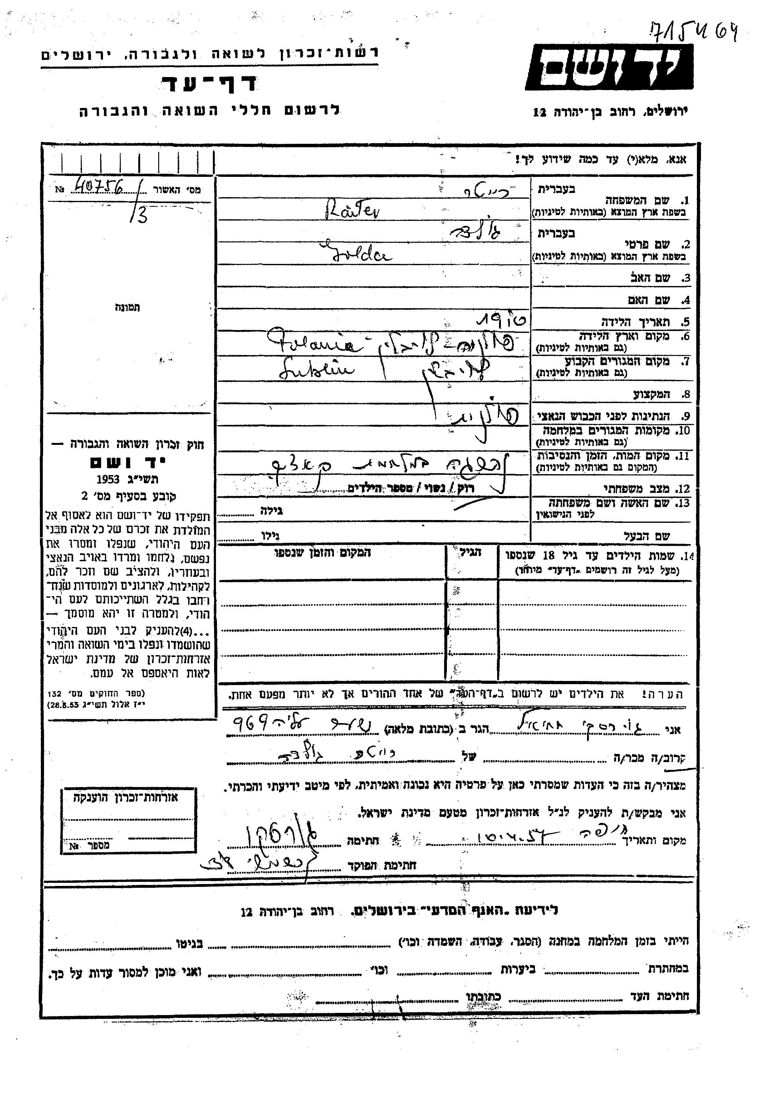 Яд Вашем - Листы свидетельских показаний Мемориального фонда