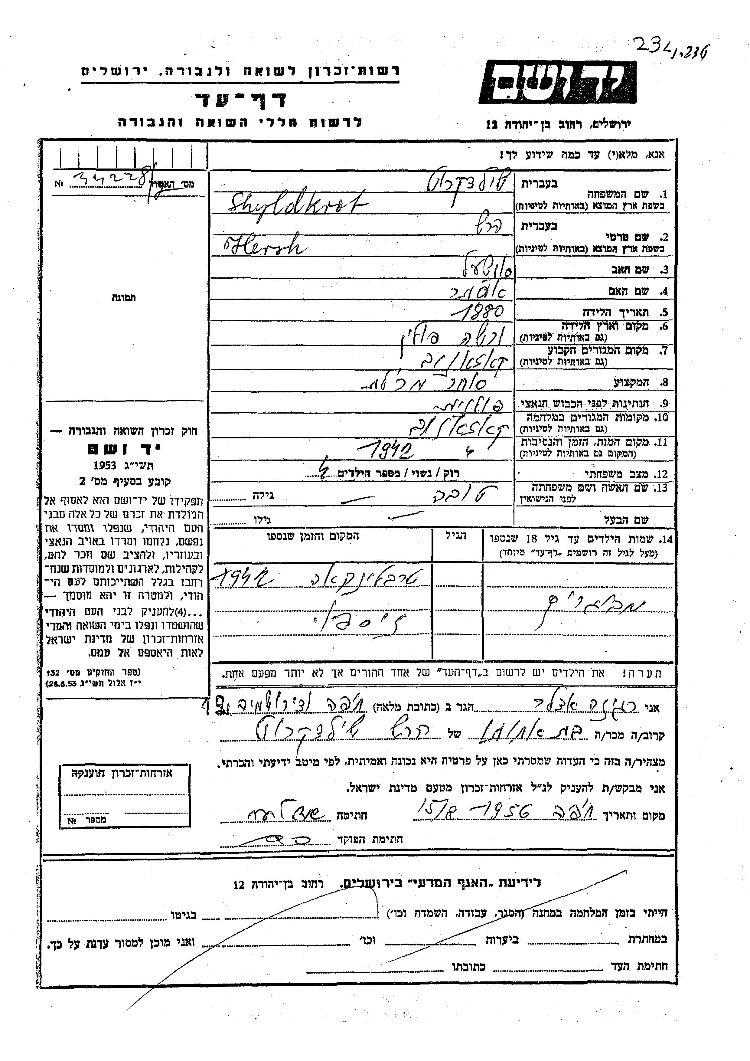 Герш Шильдкрот, место рождения: Варшава, Польша. Отец: Аншел, mать:Эстер. Бакалейщик. Женат / замужем. Место жительства до войны: Казанув, Польша. Место во время войны: Казанув, Польша.