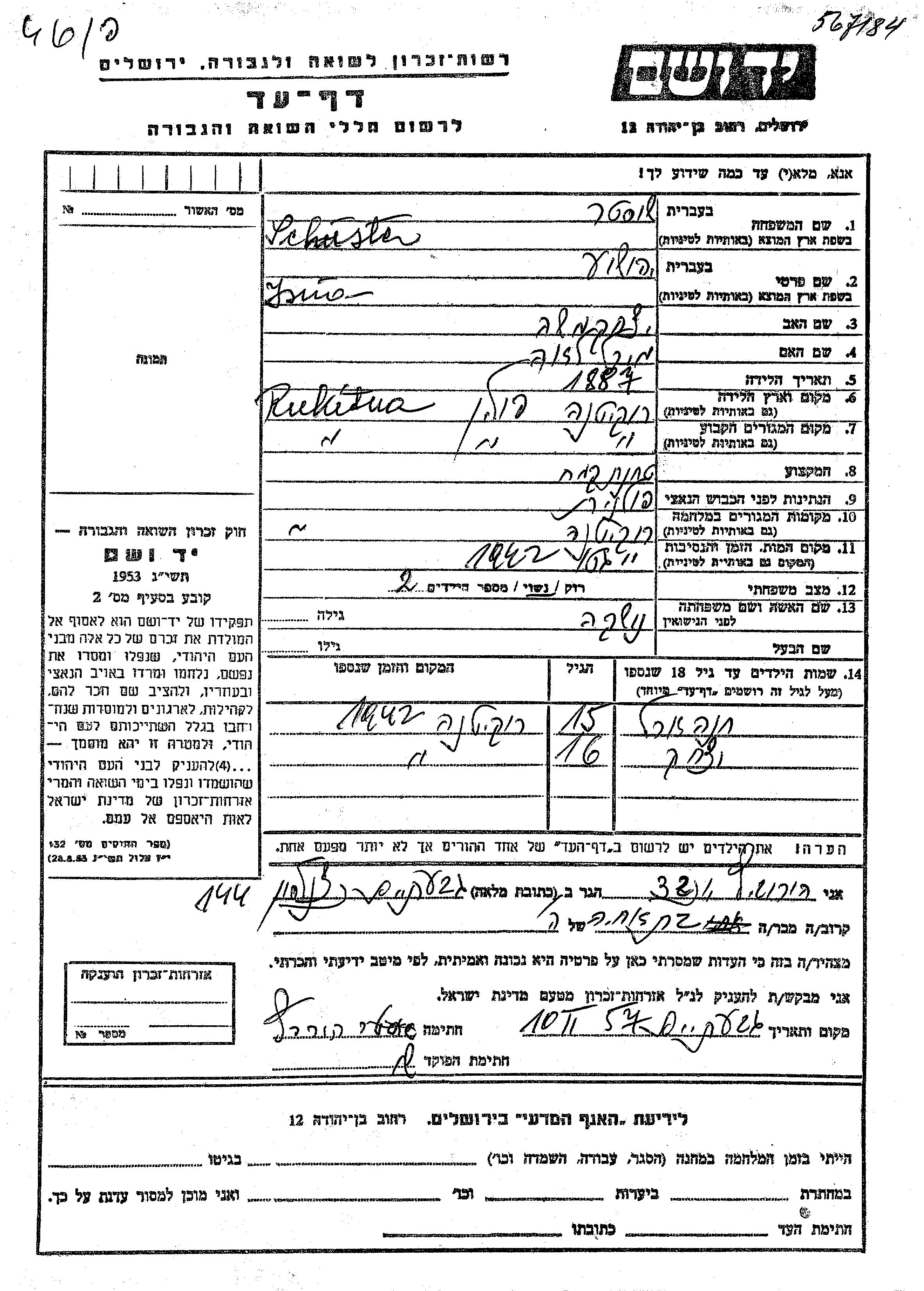 Ишуа Шустер, место рождения: Рокитное, Польша. Отец: Ицхак Моше, mать:Мирл Лея. Женат / замужем. Место жительства до войны: Рокитное, Польша. Место во время войны: Рокитное, Польша.