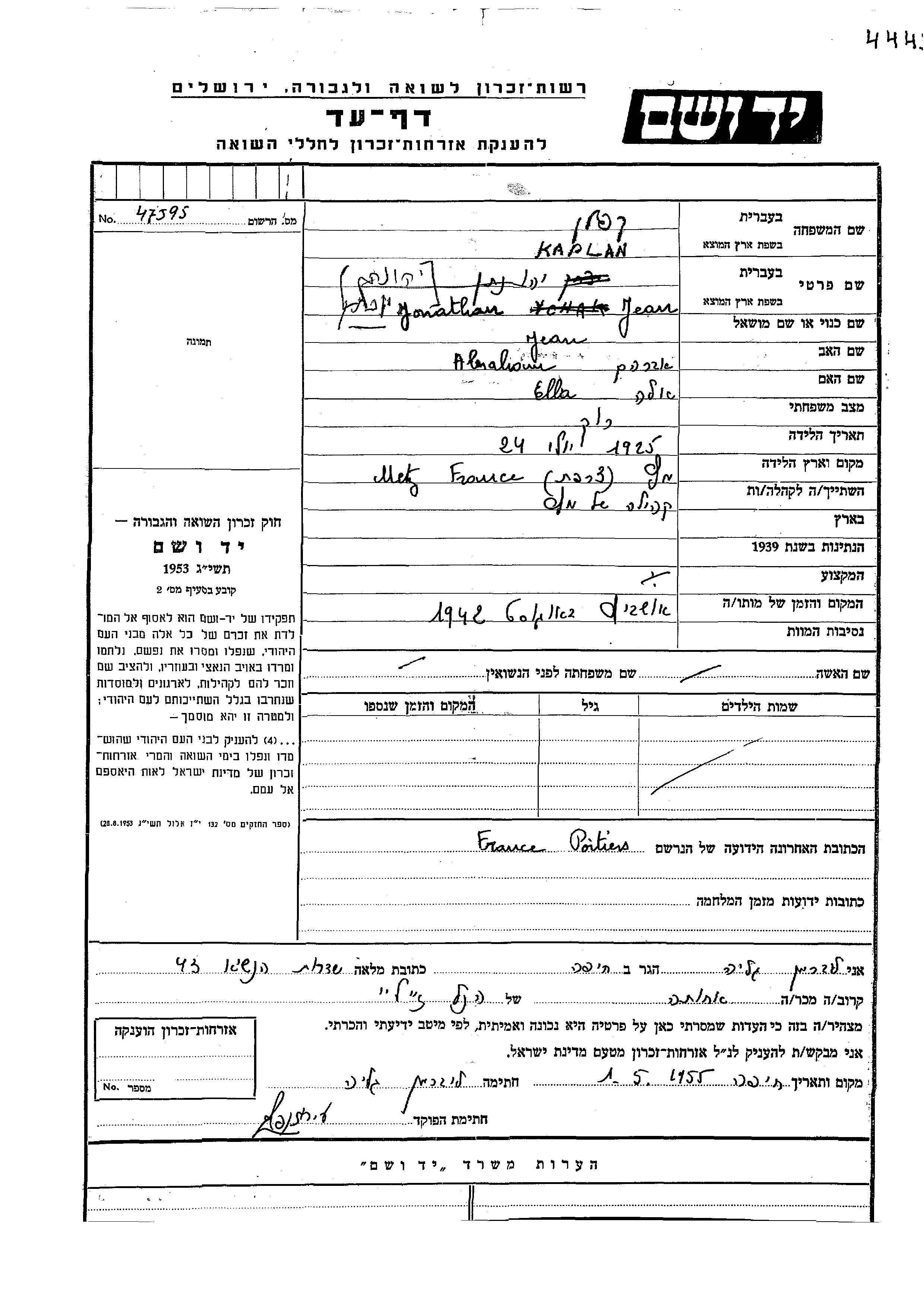 Ионатан Жан Каплан, место рождения: Мец, Франция. Отец: Абраам, mать:Элла. Место во время войны: Пуатье, Франция.