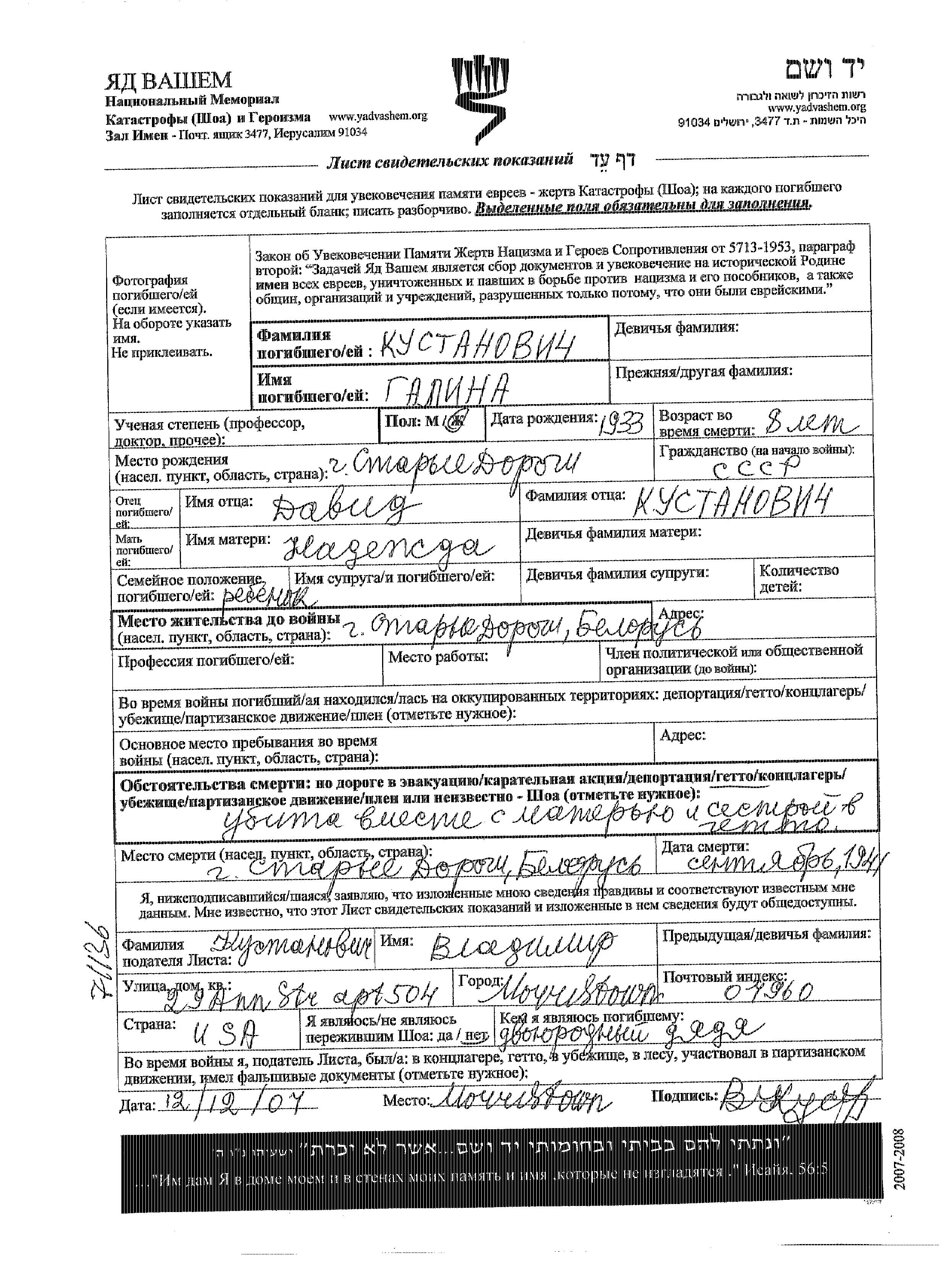 Яд Вашем - Листы свидетельских показаний Мемориального фонда