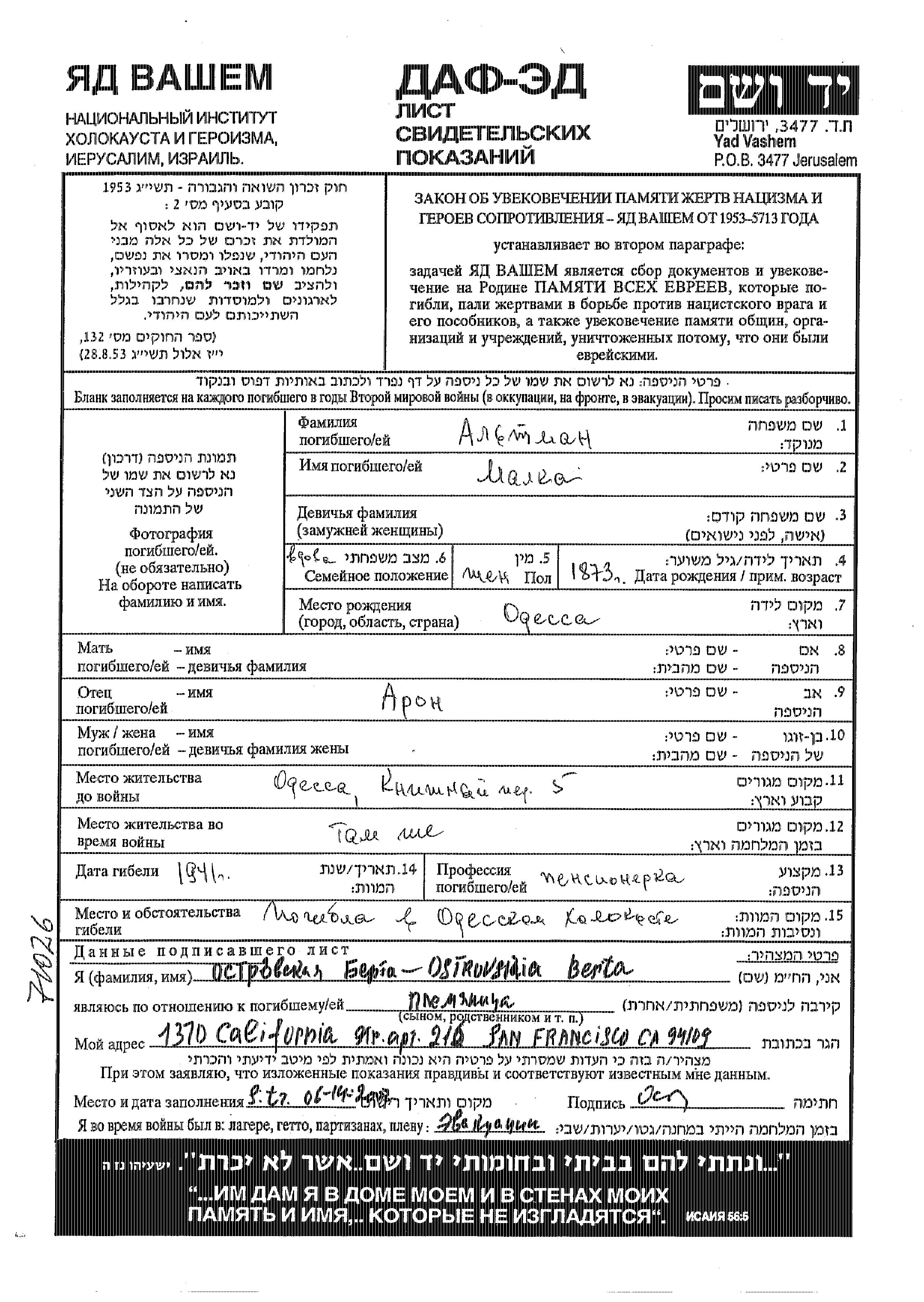 Альтман Малка 1873 Одесса, Украина (СССР) Лист свидетельских показаний