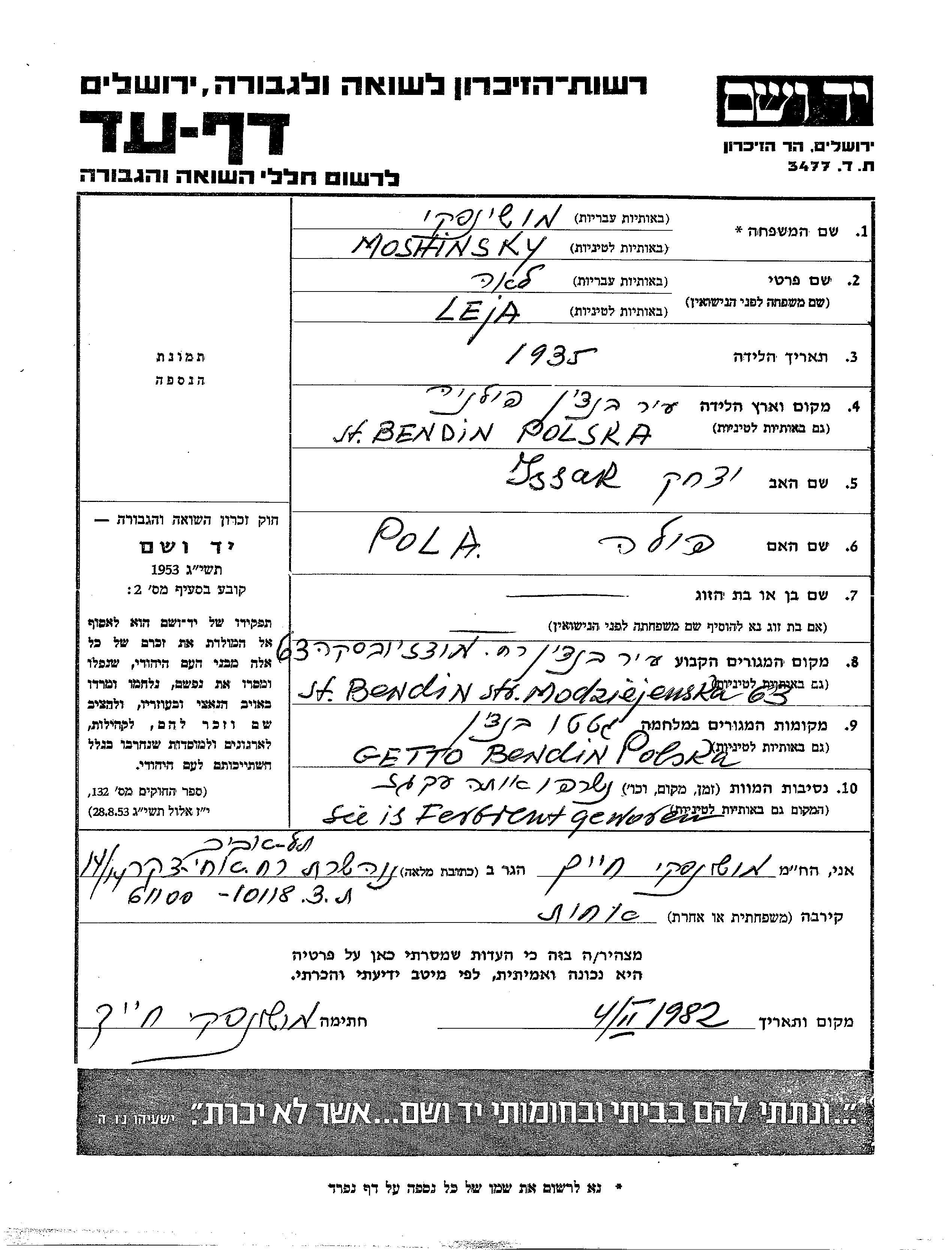 Мошински Лея 1935 Бендин, Польша Лист свидетельских показаний