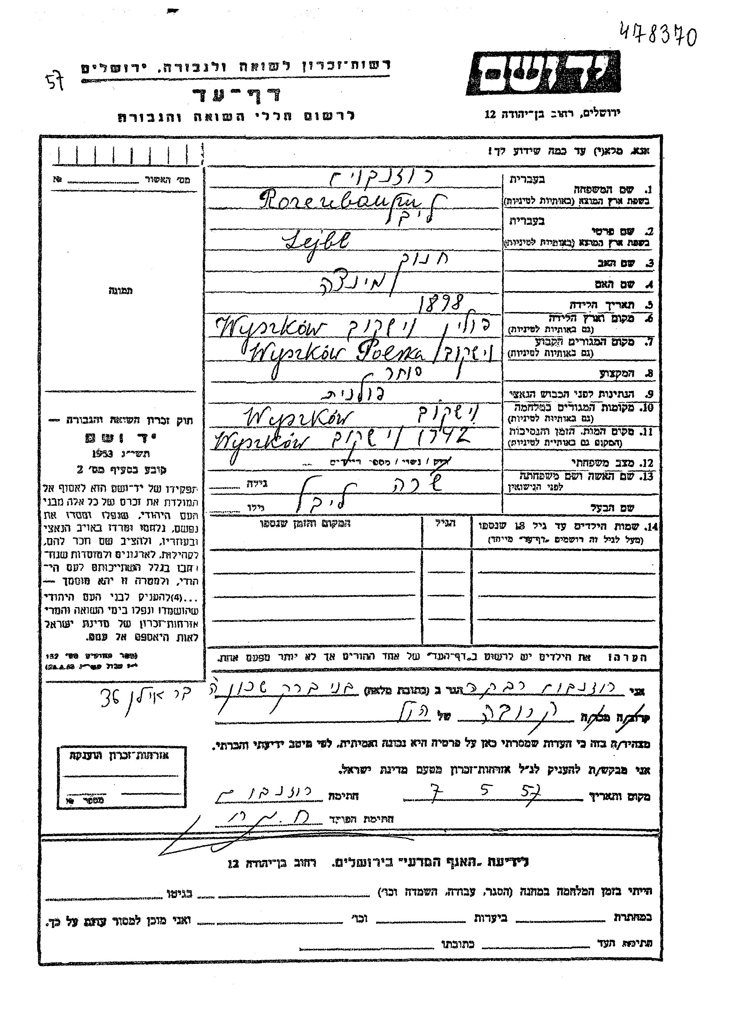 Рознбаум Лейбл 1898 Вышков, Польша Лист свидетельских показаний